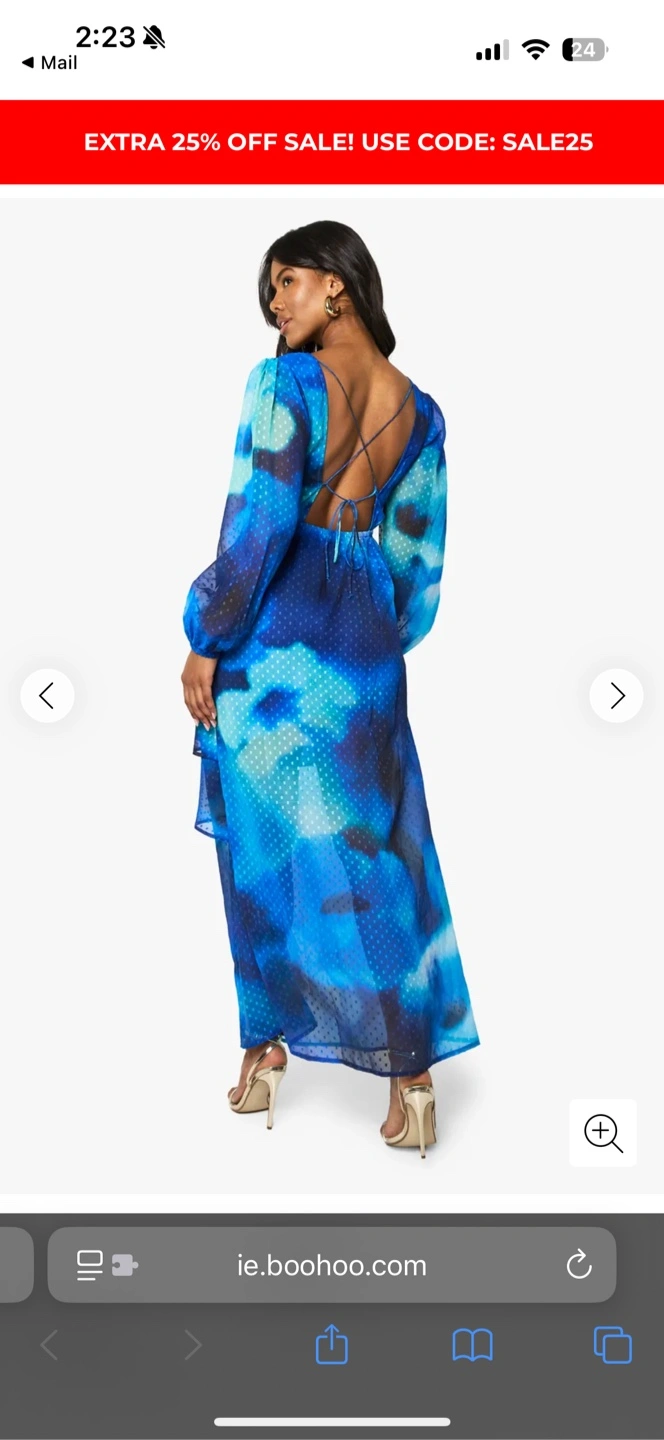 This is a beautiful blue tiered maxi dress from Boohoo. It features a V-neck and long sleeves. The dress has a tie back. Perfect for a summer event! UK 14, bought for 54€/86CAD, worn once for a wedding in June, comes with navy underskirt as under layer too short.
