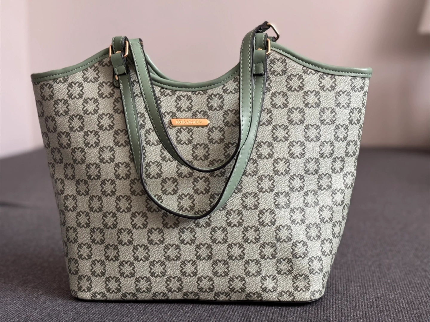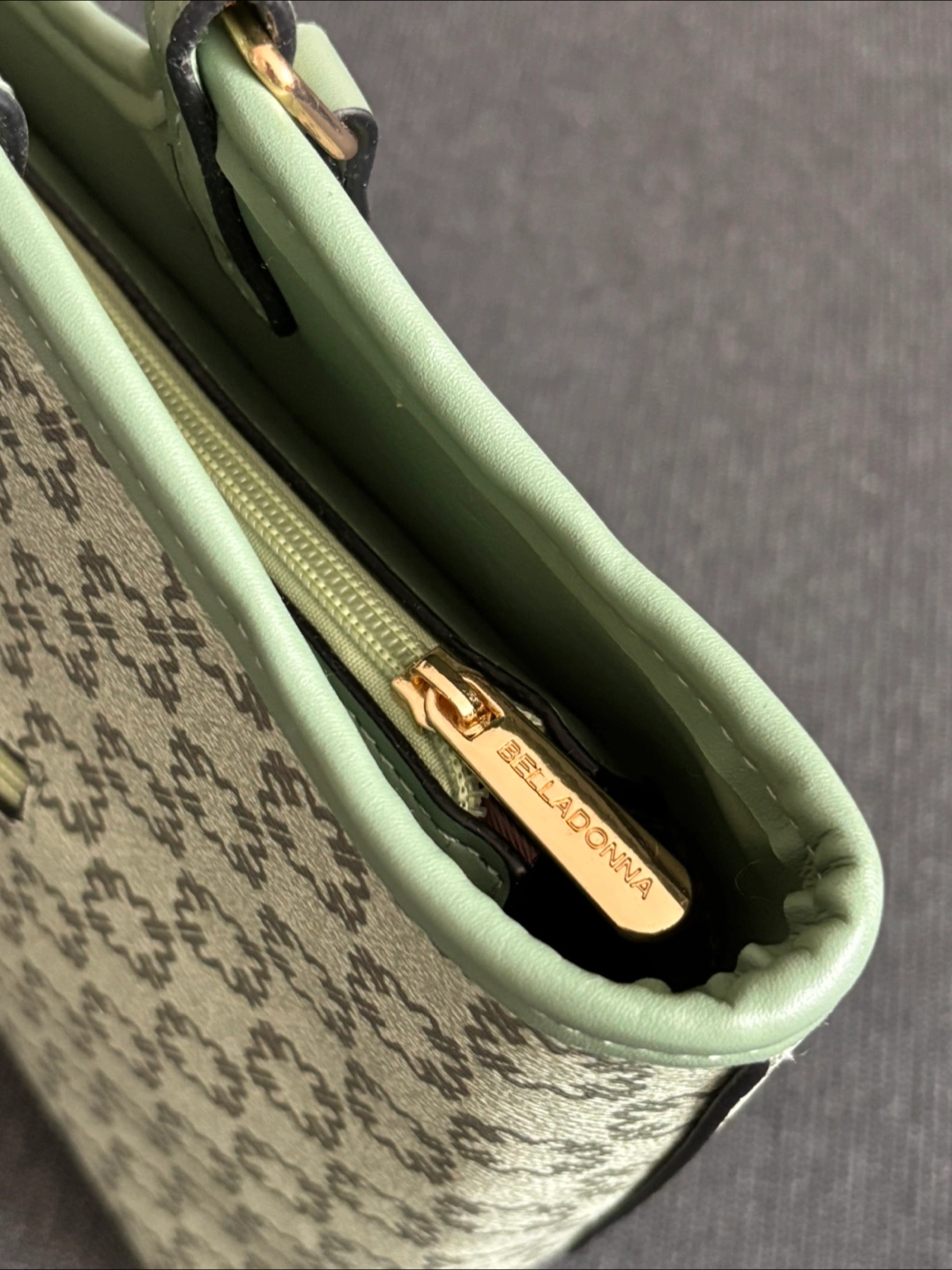 This Belladonna tote bag has a sage green patterned design. Perfect for everyday use, this never been used tote balances practicality with timeless style. Its roomy interior offers ample space for all your essentials.