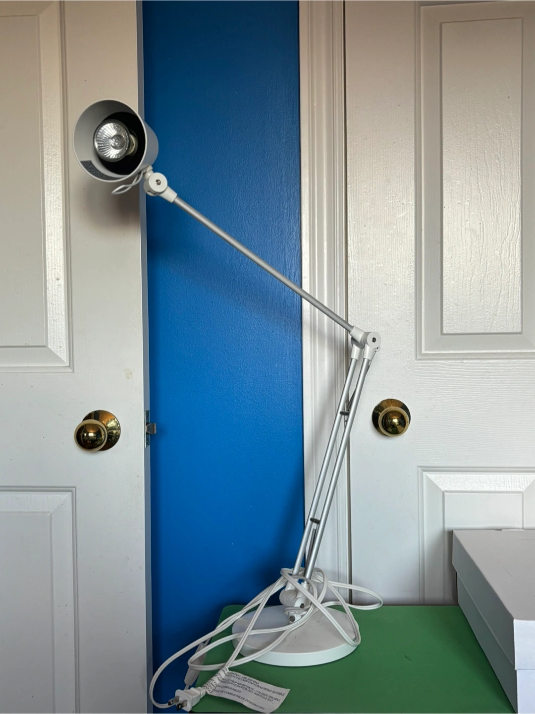 Selling a desk lamp in great condition! It's white and adjustable, so you can direct the light where you need it most. Perfect for a home office or student desk