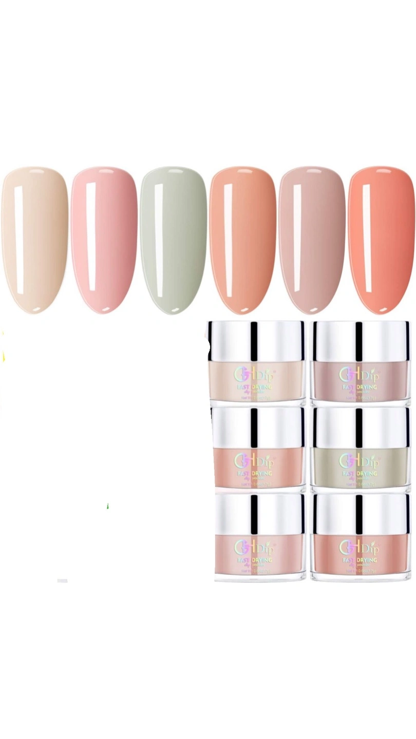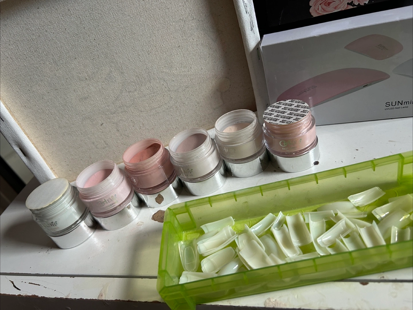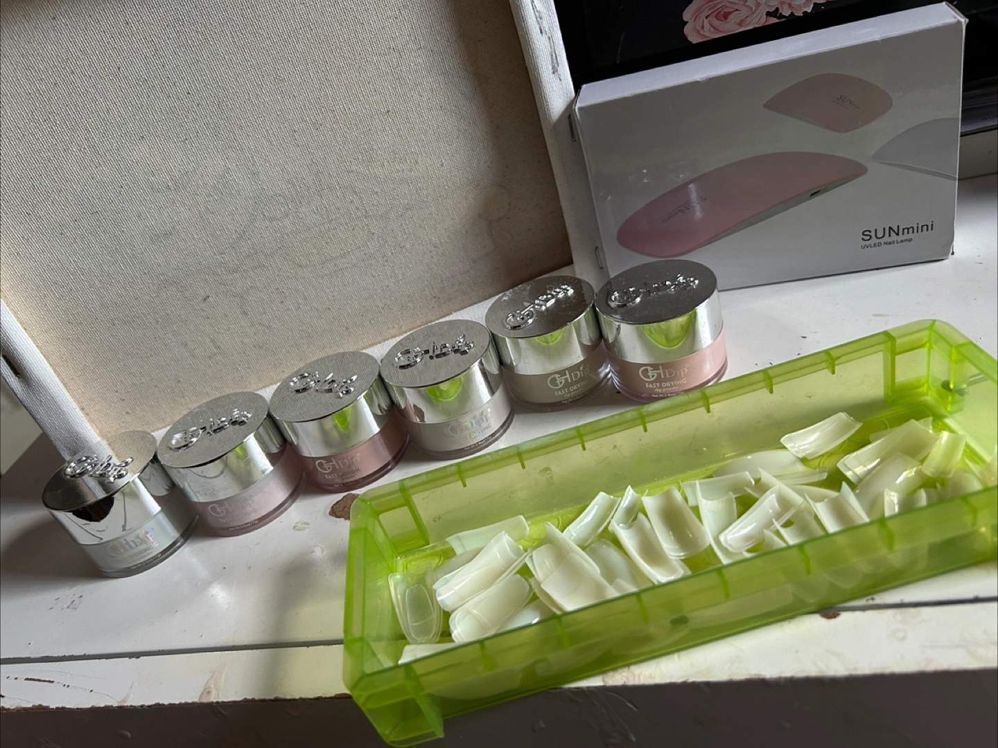 Selling a GHDip fast drying nail powder set. The set includes colors like Blush Blossom, Simply Nude, Mystery Taupe, Caramel Latte, Shiny Latte, and Honey Moon. Also included is a SUNmini UV LED nail lamp. Perfect for doing your own nails at home!