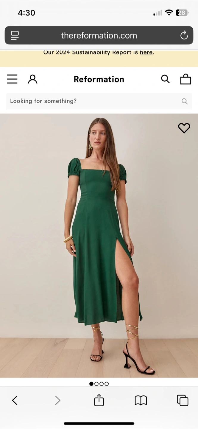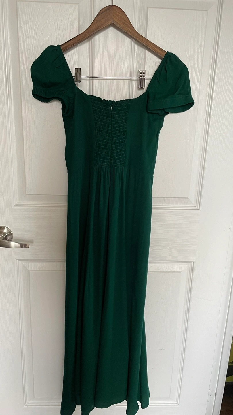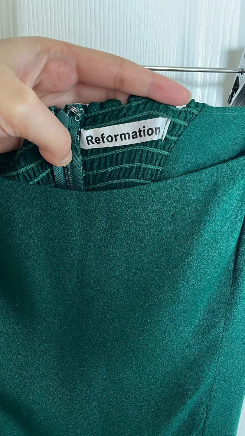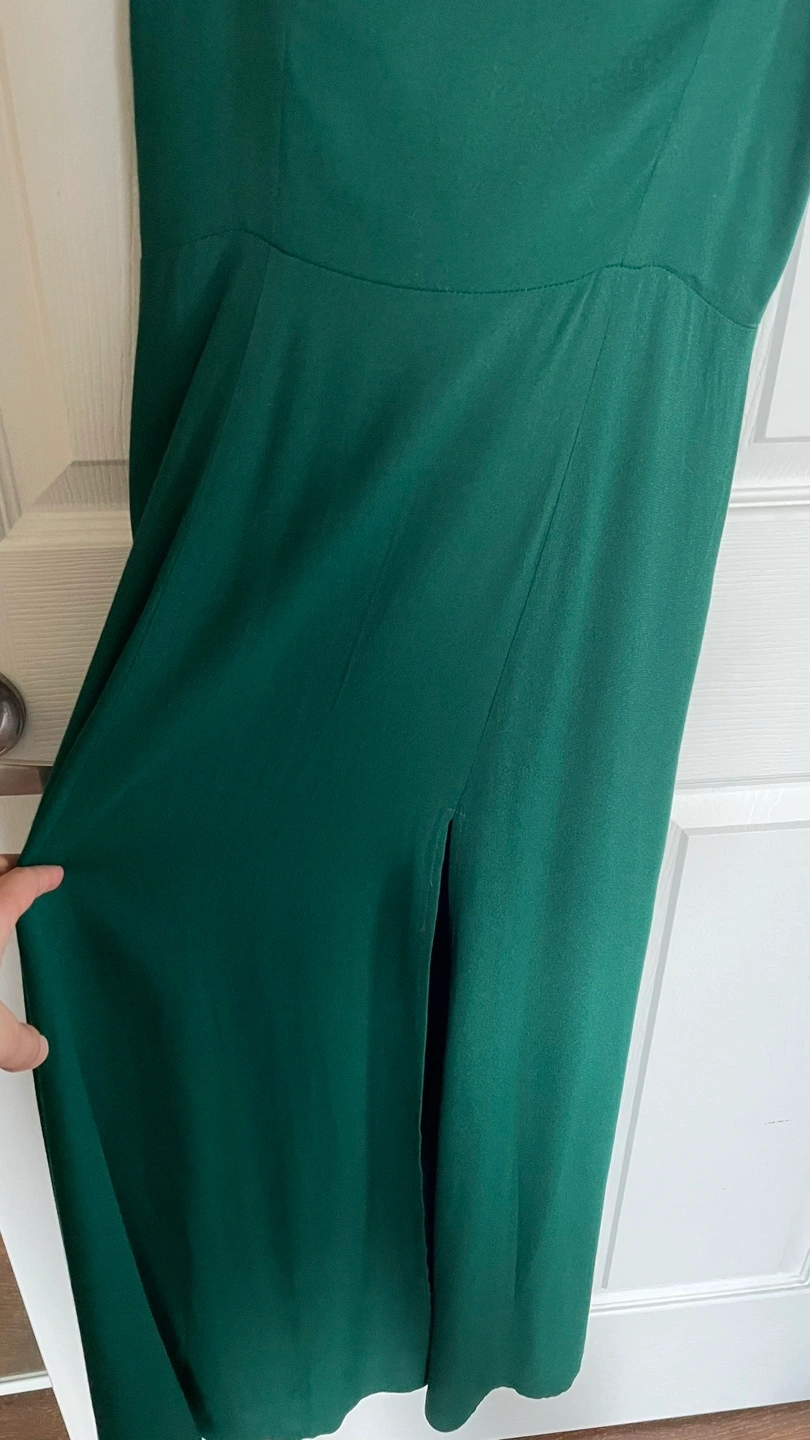 39Selling a beautiful Reformation midi dress in a lovely green colour! It's in great condition and would be perfect for a special occasion or a night out. The elastic on one sleeve has come undone, but should be an easy fix!