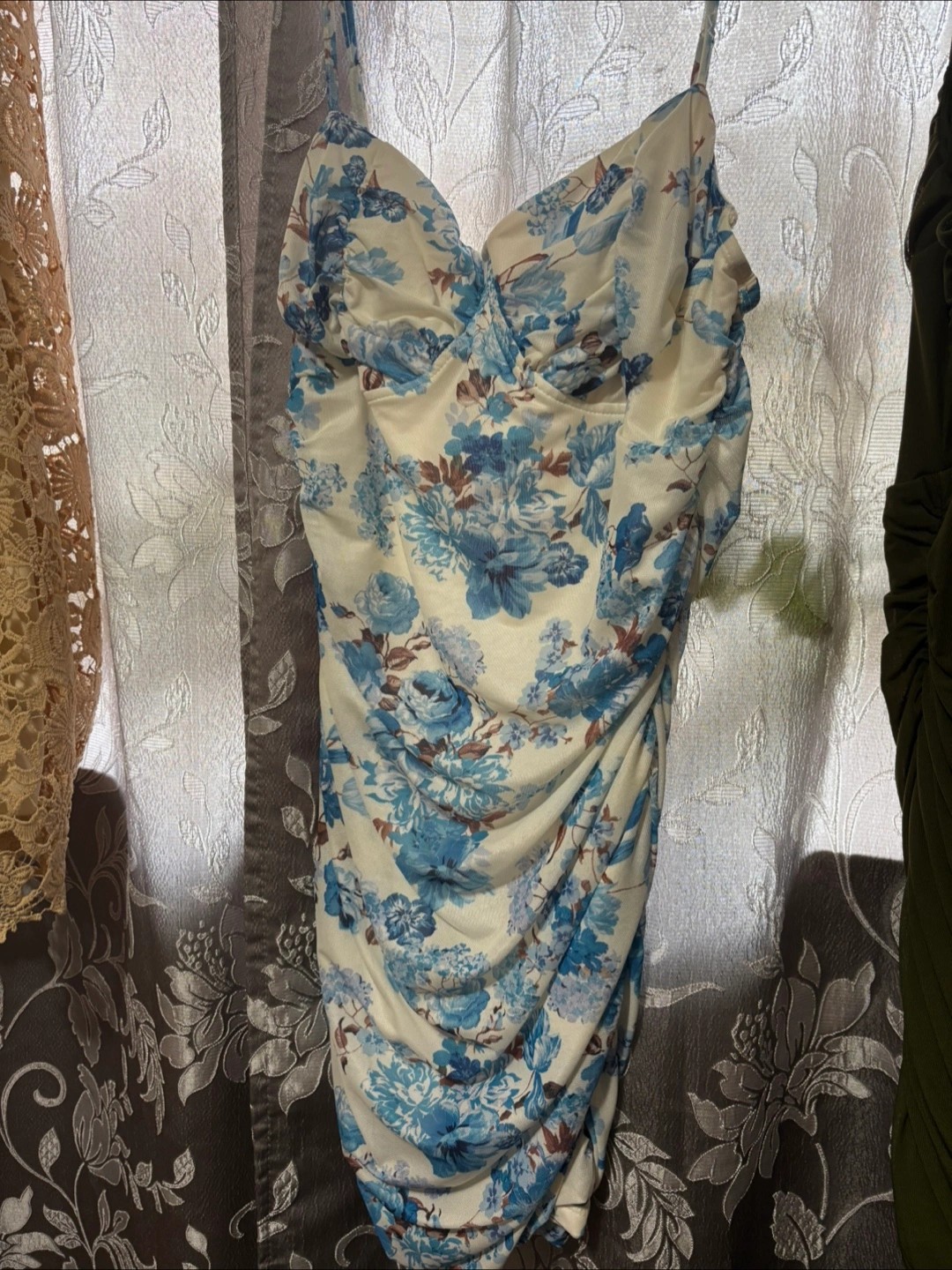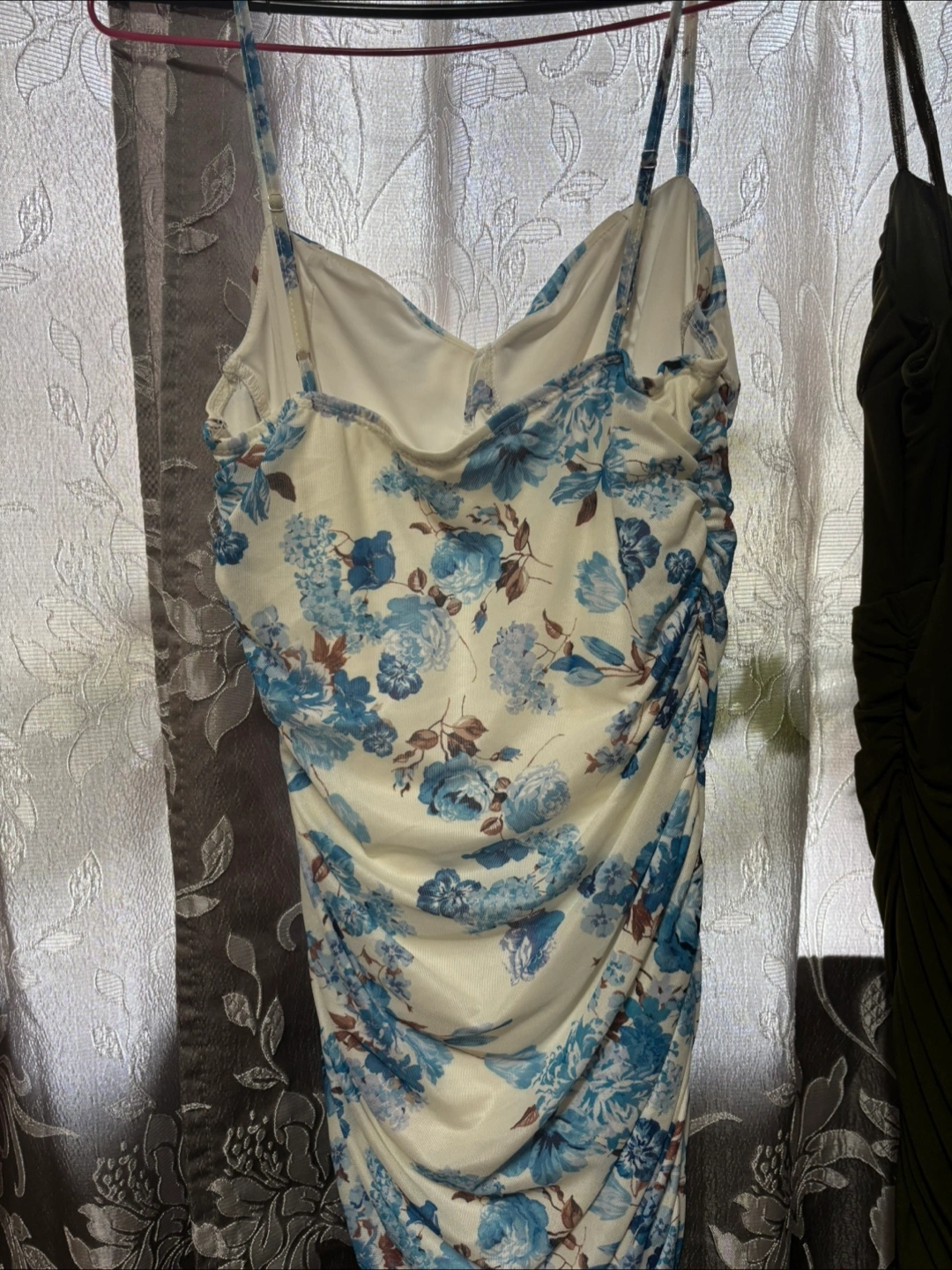 39Selling a cute Shein dress with a blue floral pattern! It's a size large (EU 40/42, US 8/10). Perfect for a summer day or a night out