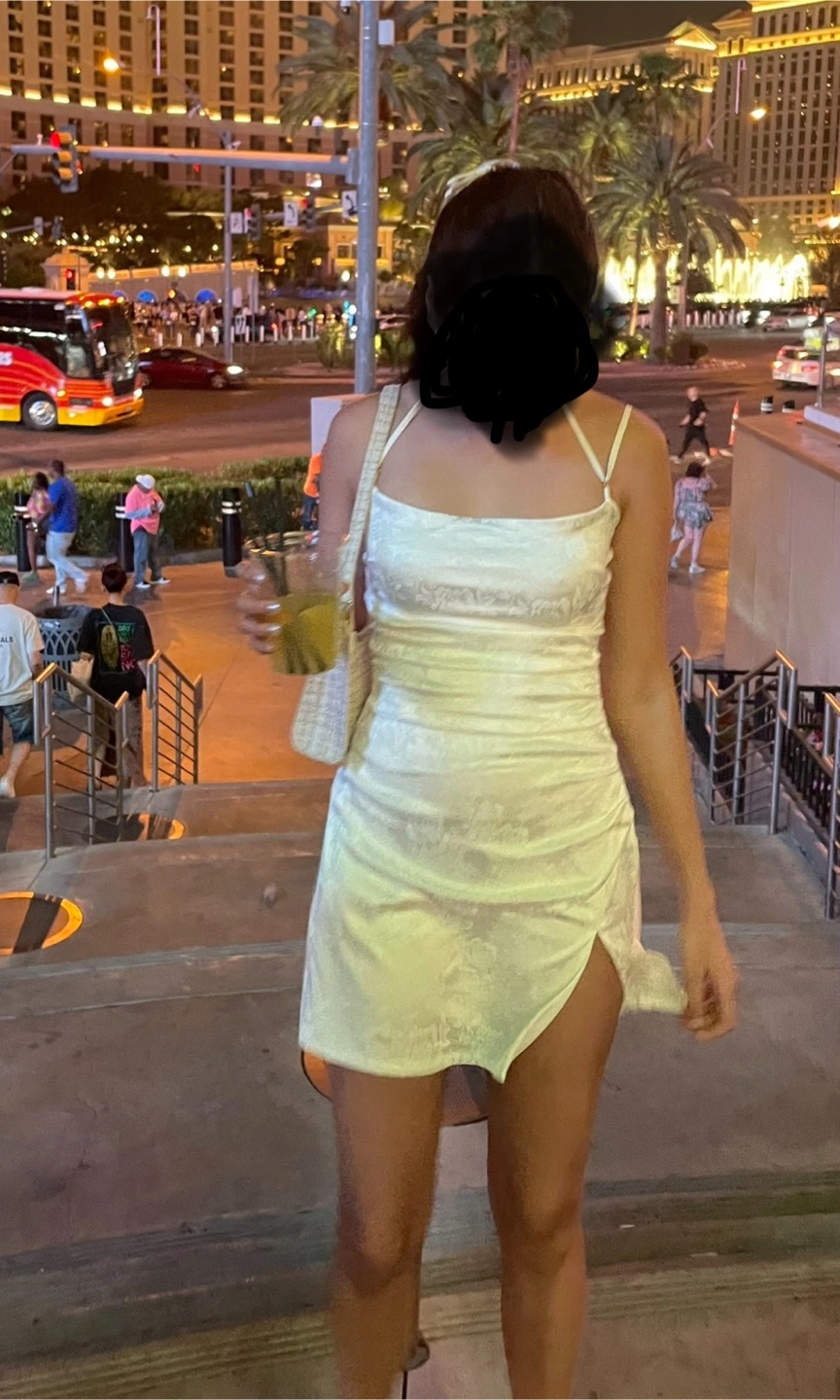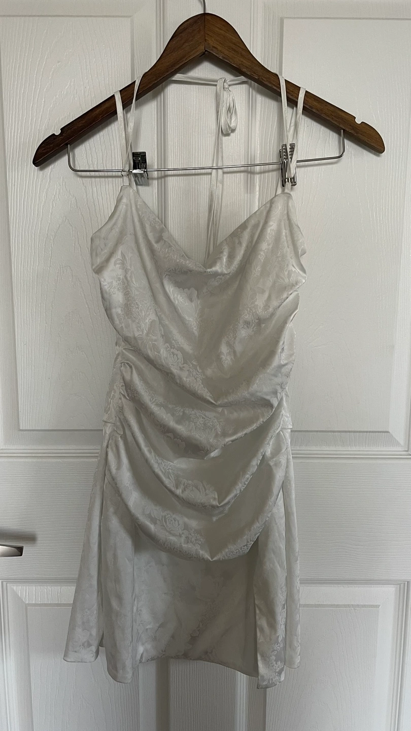 39Selling a cute white mini dress from shein, worn once for my bachelorette! It's in great condition and features a halter tie and a lace-up back detail. Perfect for summer outings or a night out