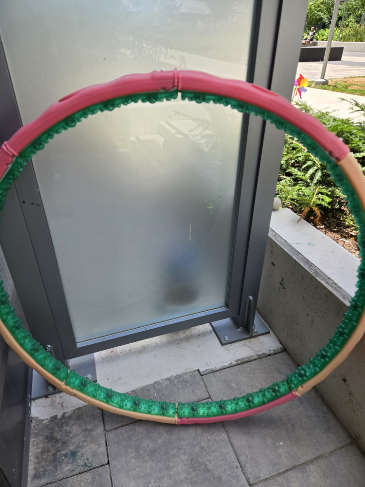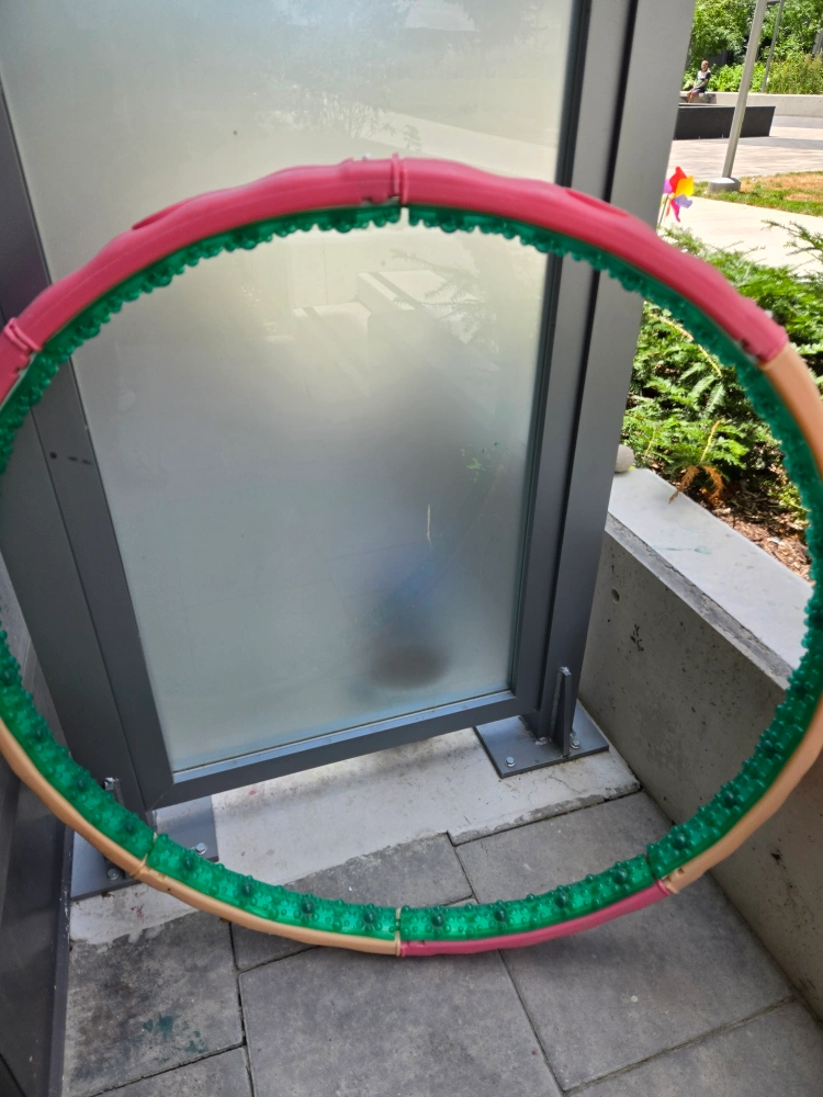 Selling a weighted hula hoop in good condition! It's pink, green, and beige. Perfect for a fun workout