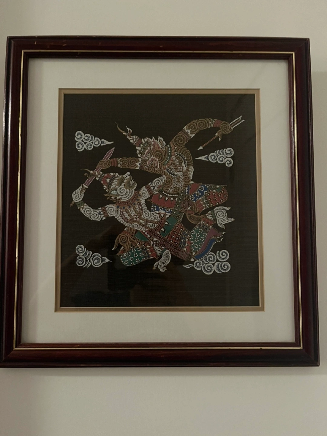 This is a framed piece of Thai folk art. The frame is a dark wood colour. The art itself features figures in a stylized design with cloud-like accents.