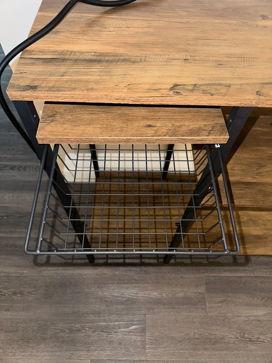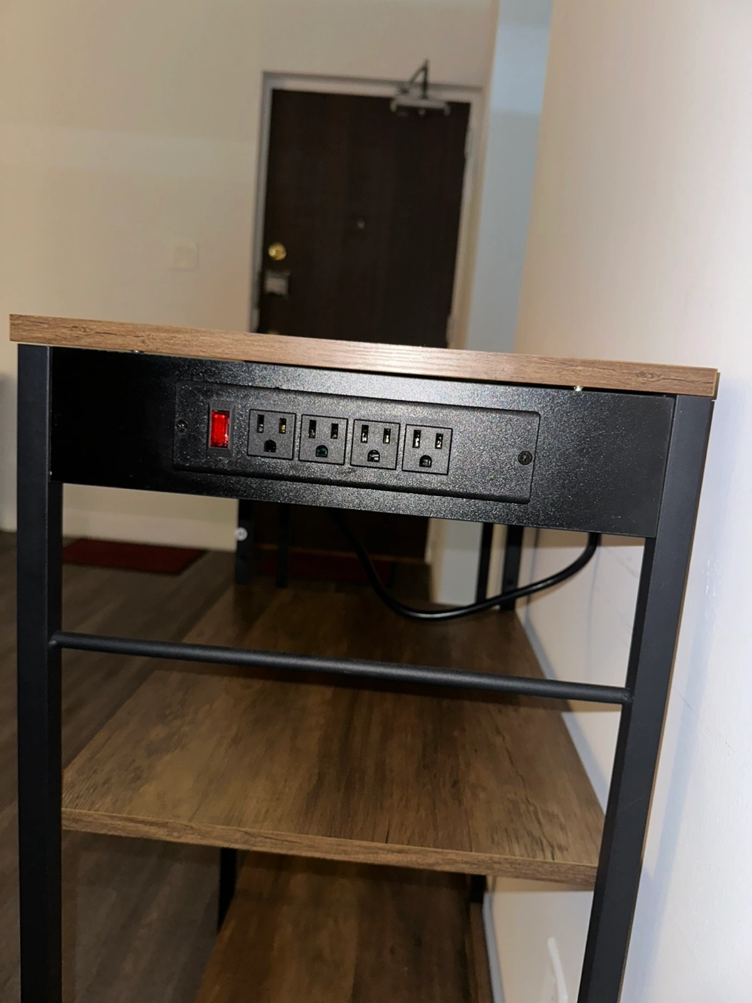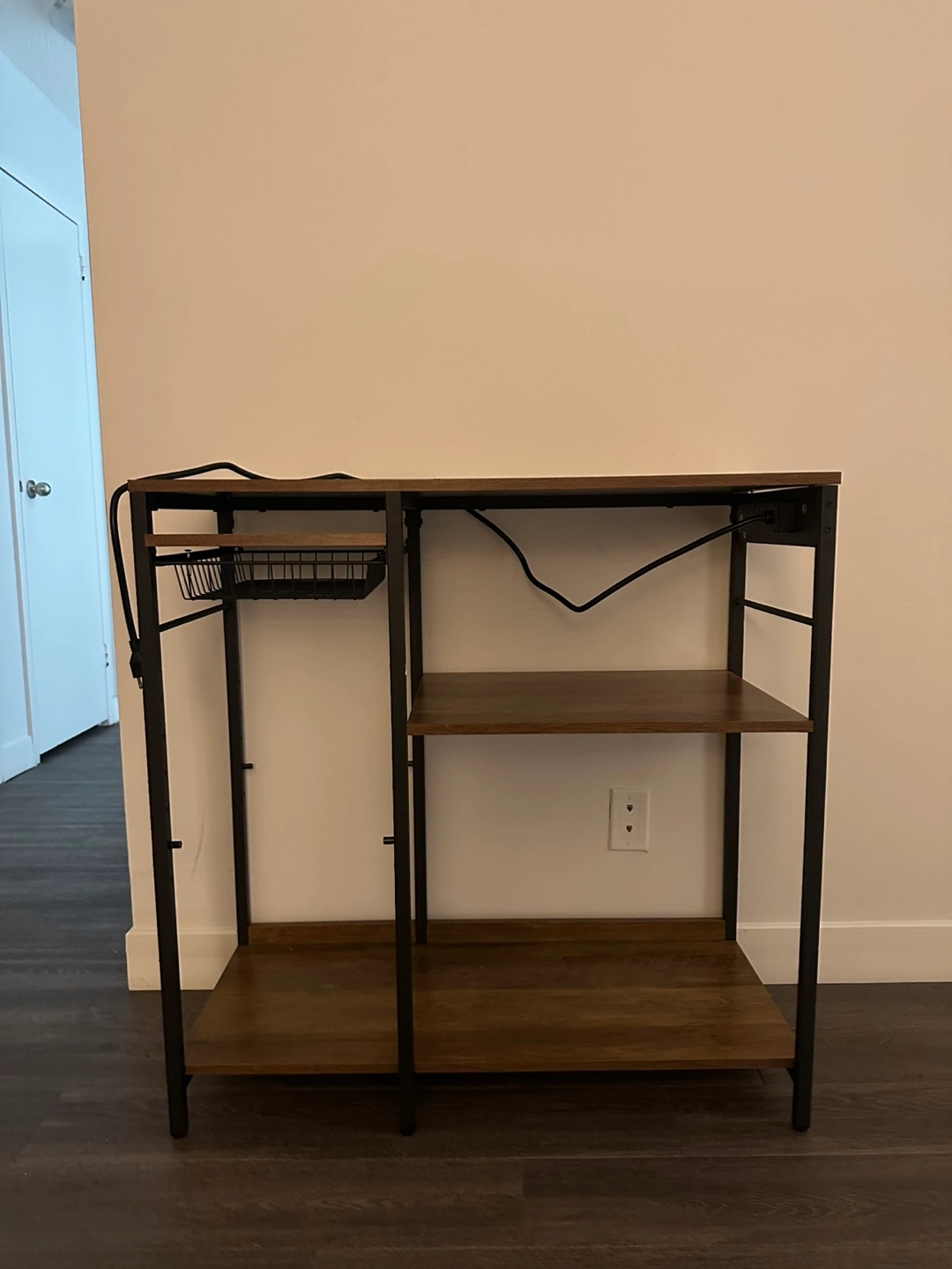 91Sturdy and stylish multi-functional kitchen or utility rack, perfect for small apartments, condos, or dorms! This industrial-style shelving unit features: • 3-tier wooden shelves with durable black metal frame • Built-in power strip (4 outlets + power switch) for convenient appliance access • Side basket for holding utensils, dish towels, or supplies • Great for use as a microwave stand, coffee station, or mini bar
