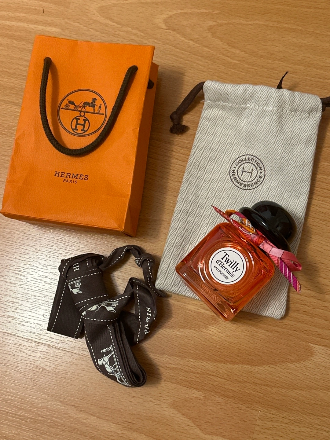 Selling a bottle of Hermès Twilly d'Hermès Eau Poivrée perfume! It comes with a small bag and dust pouch (not the ones that came with but ones I had, also I think the ribbon is from a purse box because it’s very long). Only used twice