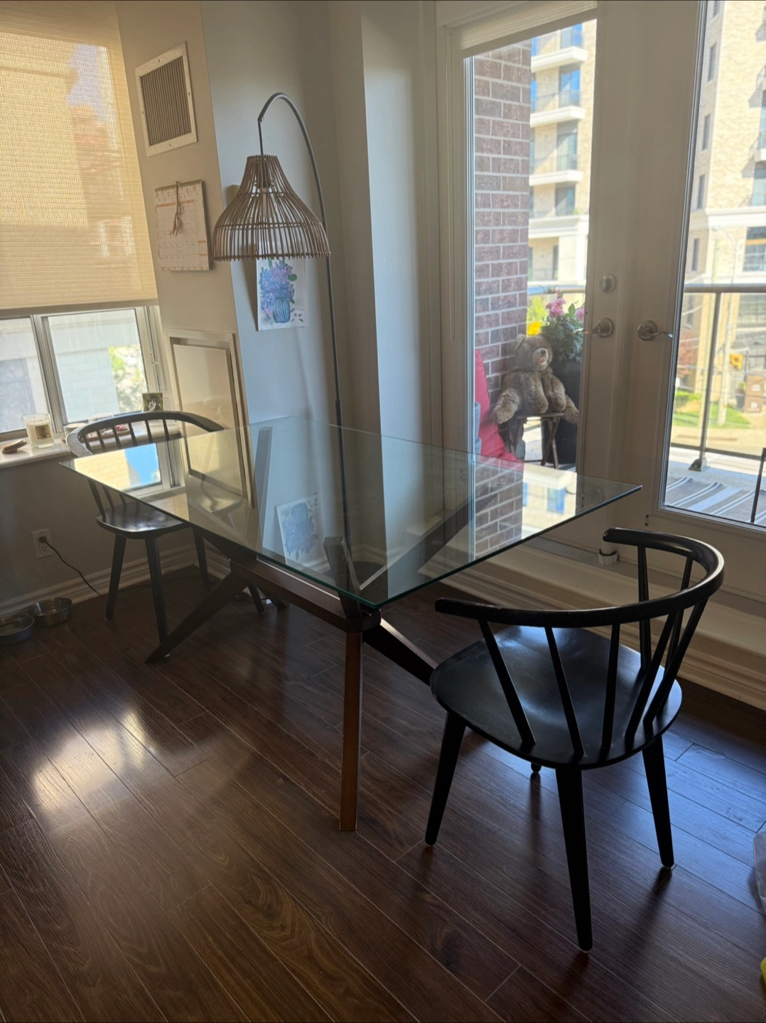 Selling a glass top dining table with a unique wood base. It's in a very good condition and would look lovely in any dining room or kitchen. The table comfortably seats four to six people and adds a touch of modern elegance to your space.