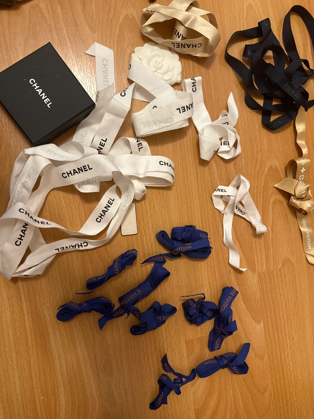 Selling a collection of designer ribbons from Chanel, Louis Vuitton, and Prada. Perfect for crafting, gift wrapping, or adding a touch of luxury to any project but also great when gifting! There’s also a Chanel jewelry box.