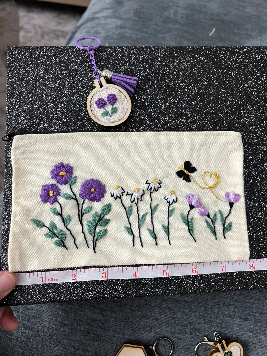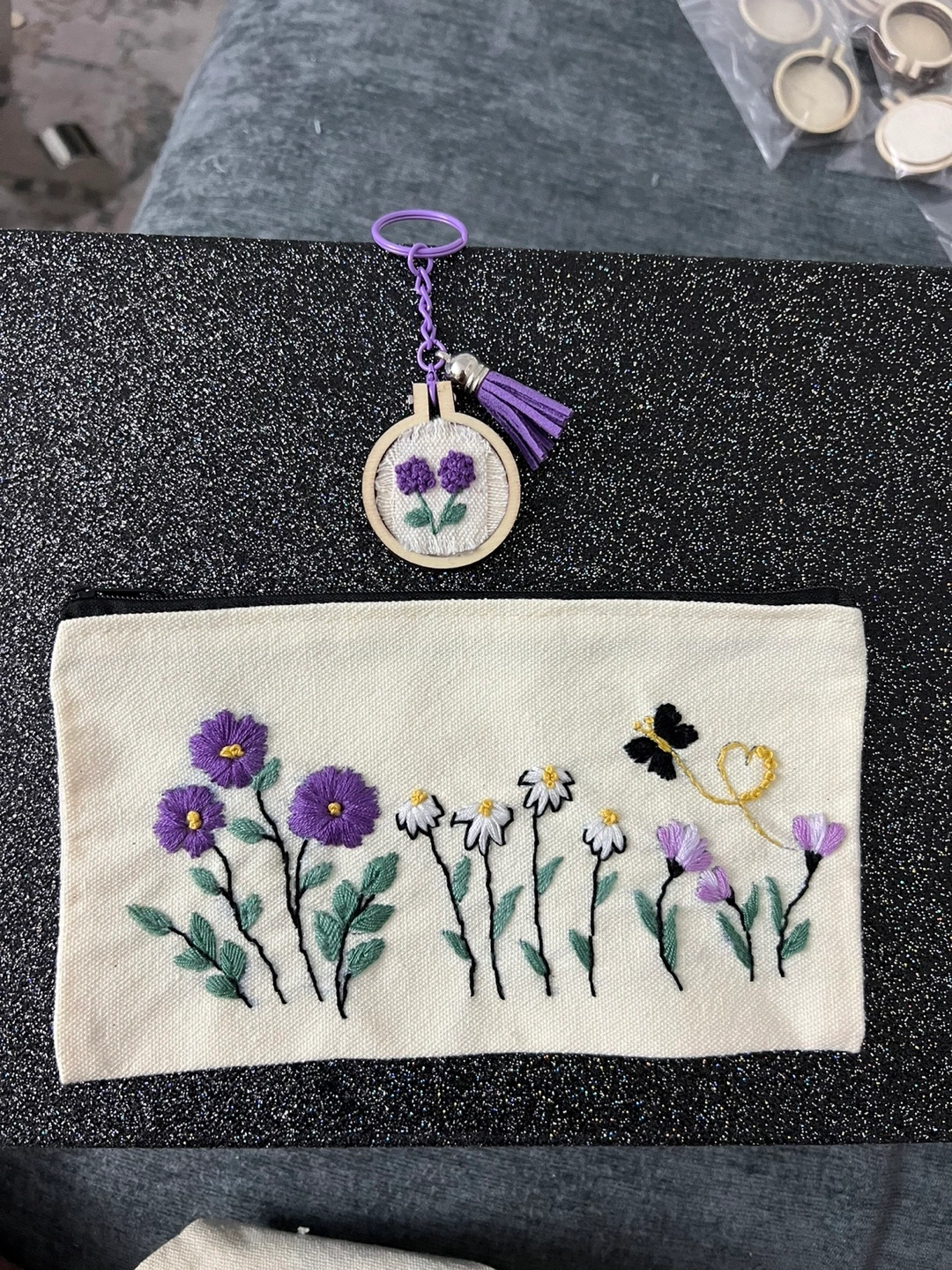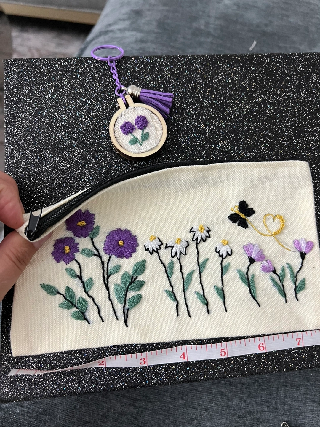 I have a cute, handmade zipper pouch for sale! It features beautiful floral embroidery in shades of purple, white, and green, along with a charming butterfly detail. Perfect for storing small items or using as a makeup bag hand made with a key chain
