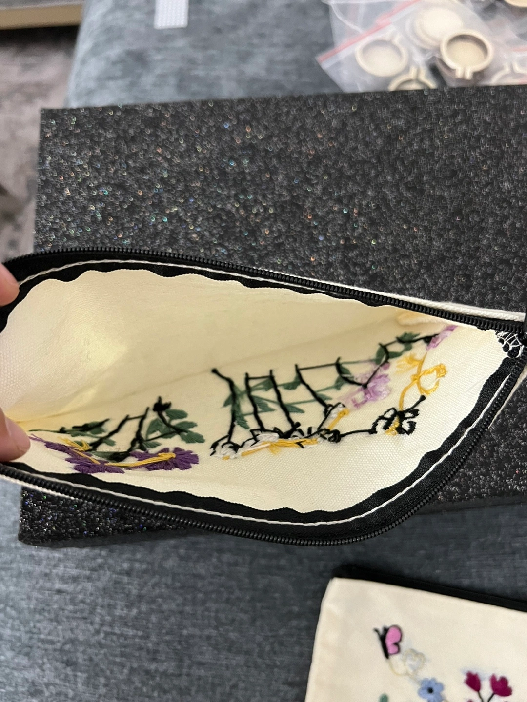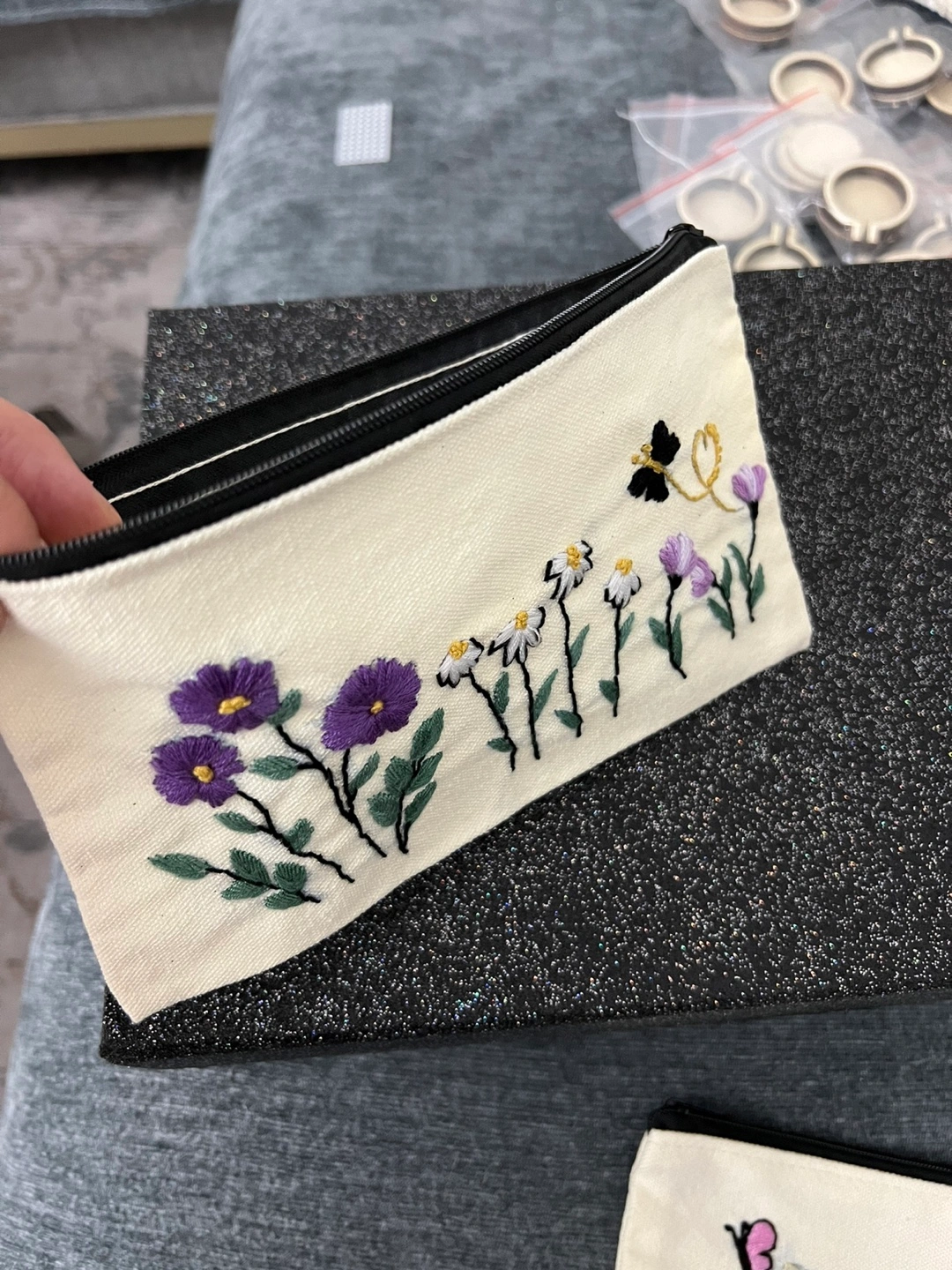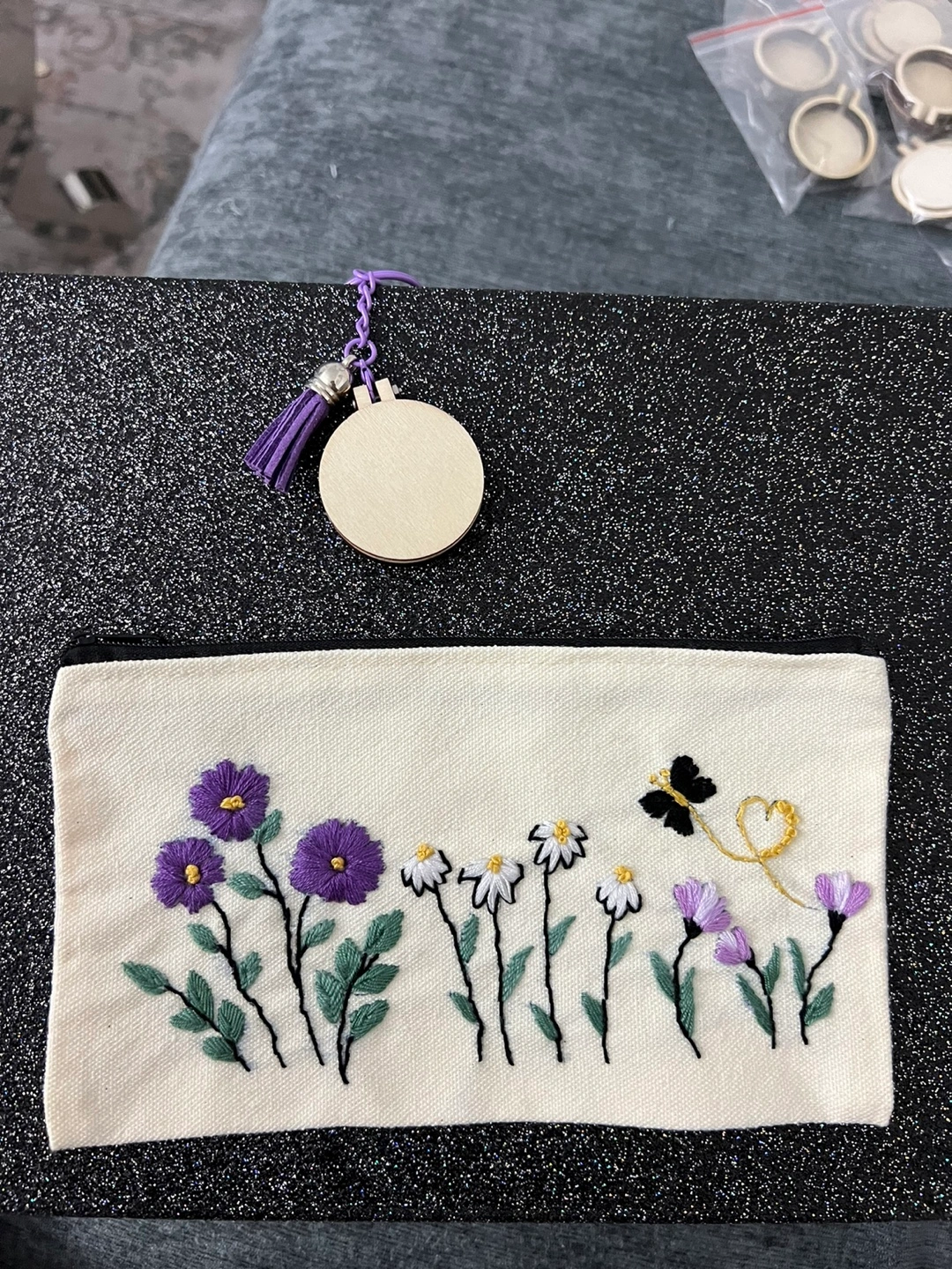 I have a cute, handmade zipper pouch for sale! It features beautiful floral embroidery in shades of purple, white, and green, along with a charming butterfly detail. Perfect for storing small items or using as a makeup bag hand made with a key chain