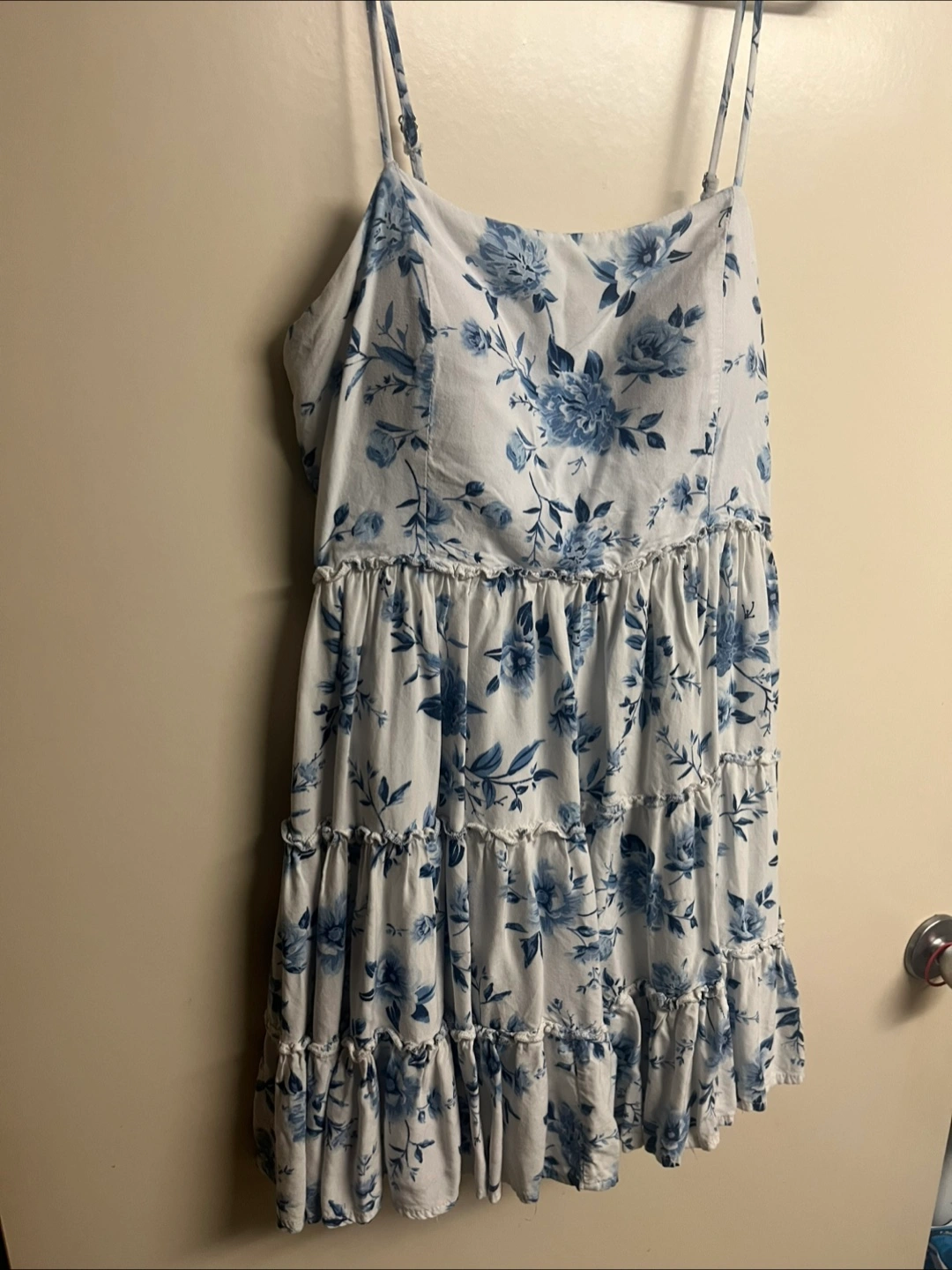 A cute sundress with a blue floral print! It's perfect for summer days and is in great condition. The dress features a tiered design and adjustable straps.