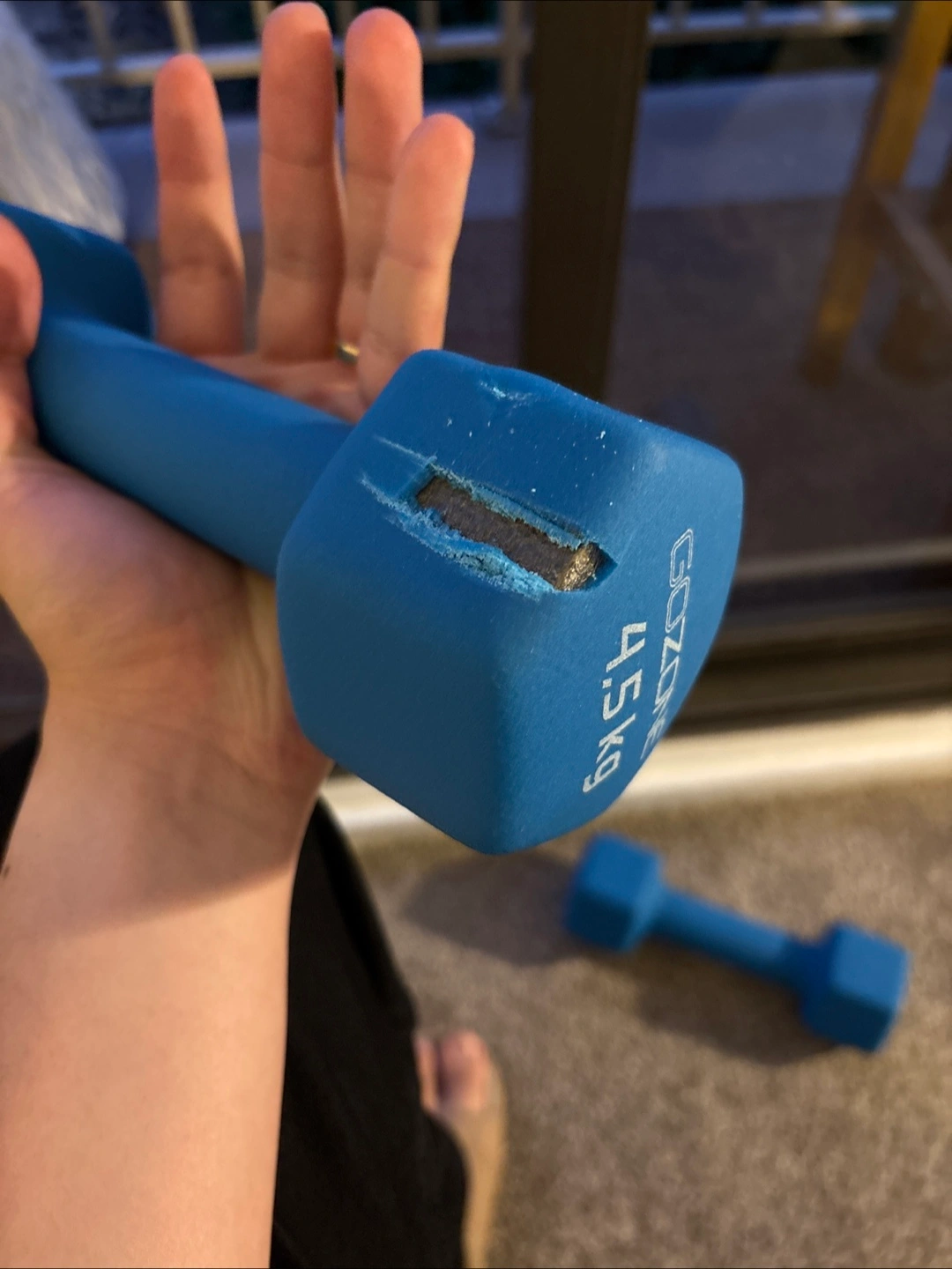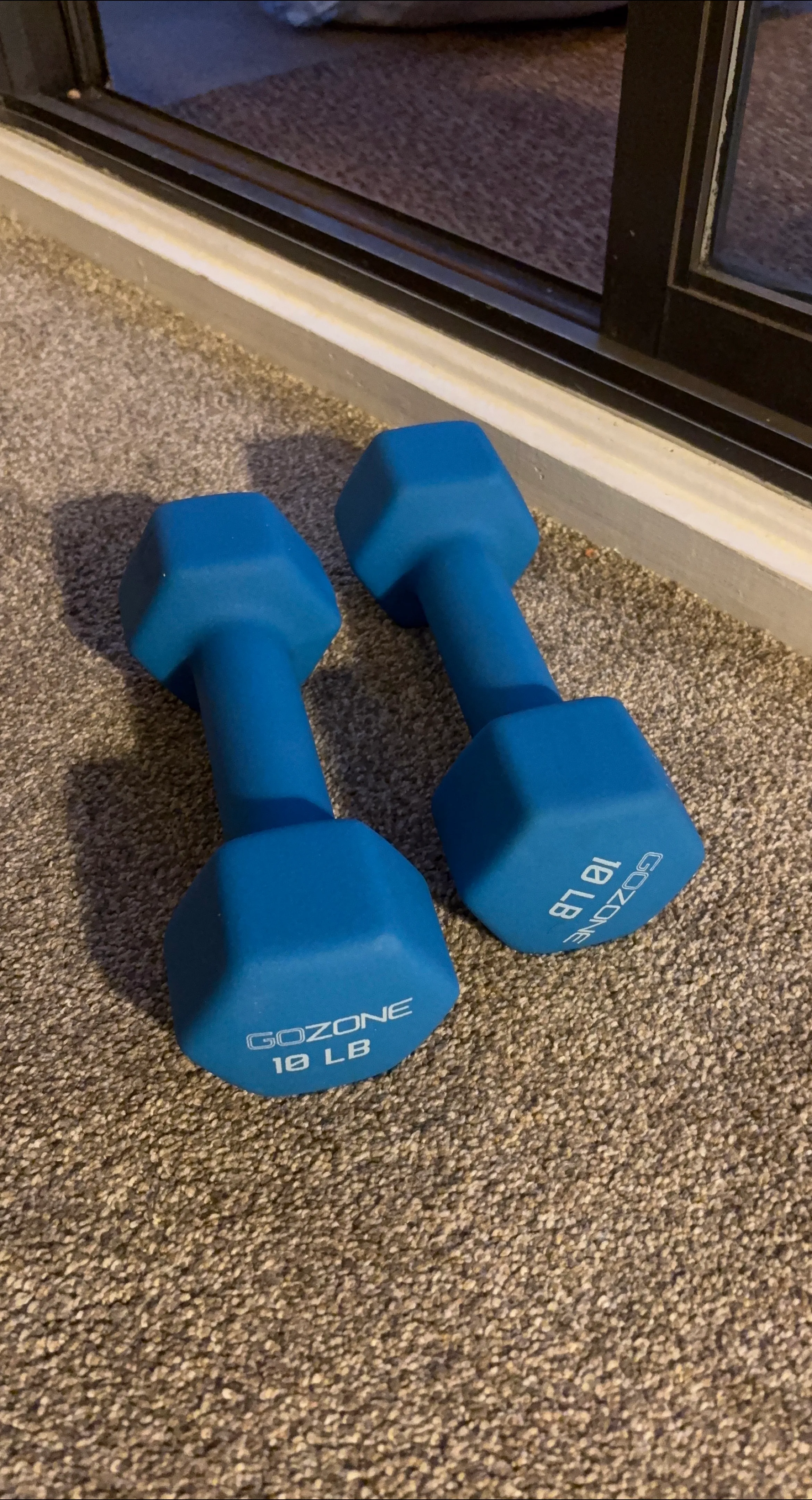 Selling a pair of GoZone dumbbells, each weighing 10 lbs. They're in blue and are great for home workouts. One of the dumbbells has some damage as shown in the photos, but still works great!