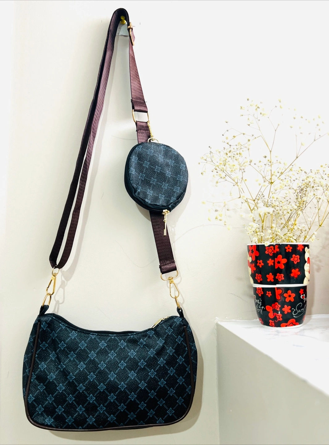 Cute crossbody bag with a detachable coin purse! It features a stylish pattern and a comfortable strap.