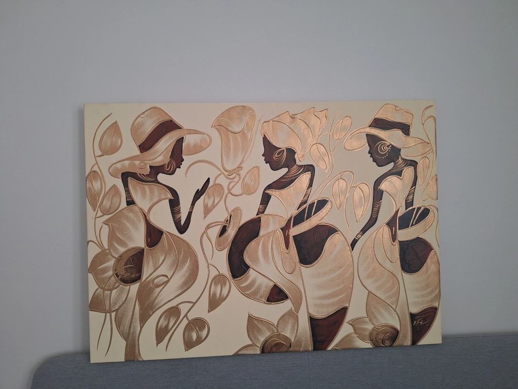 A beautiful art painting with an African women theme. The painting features three women in hats and dresses, surrounded by floral designs. The colours are neutral, with shades of beige, brown, and gold. It would be a lovely addition to any home decor