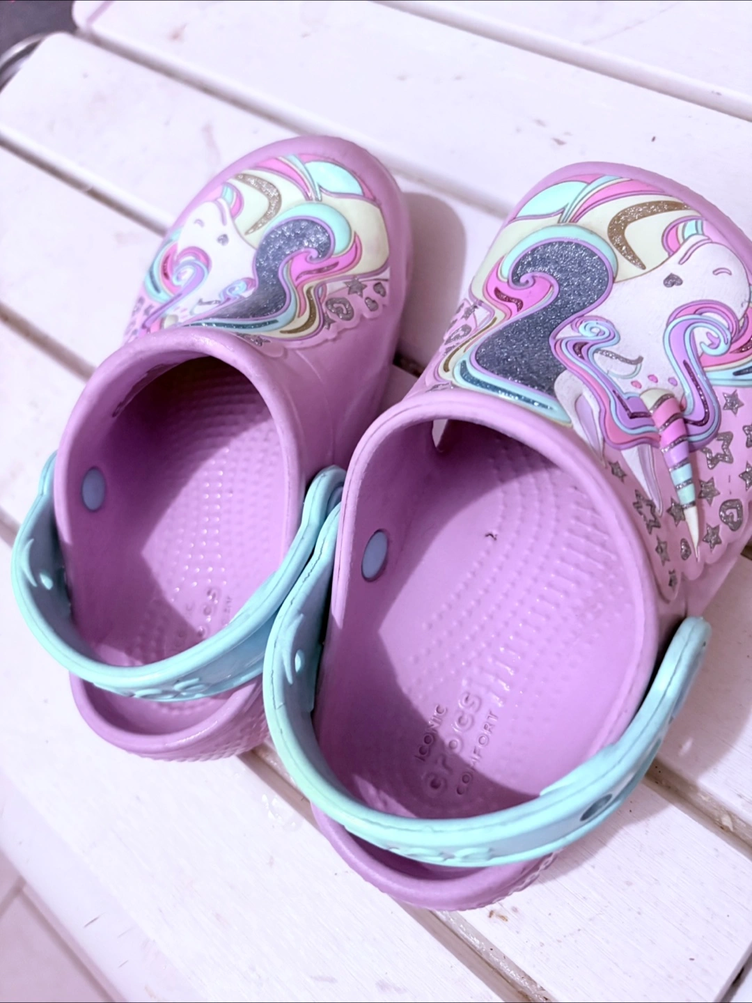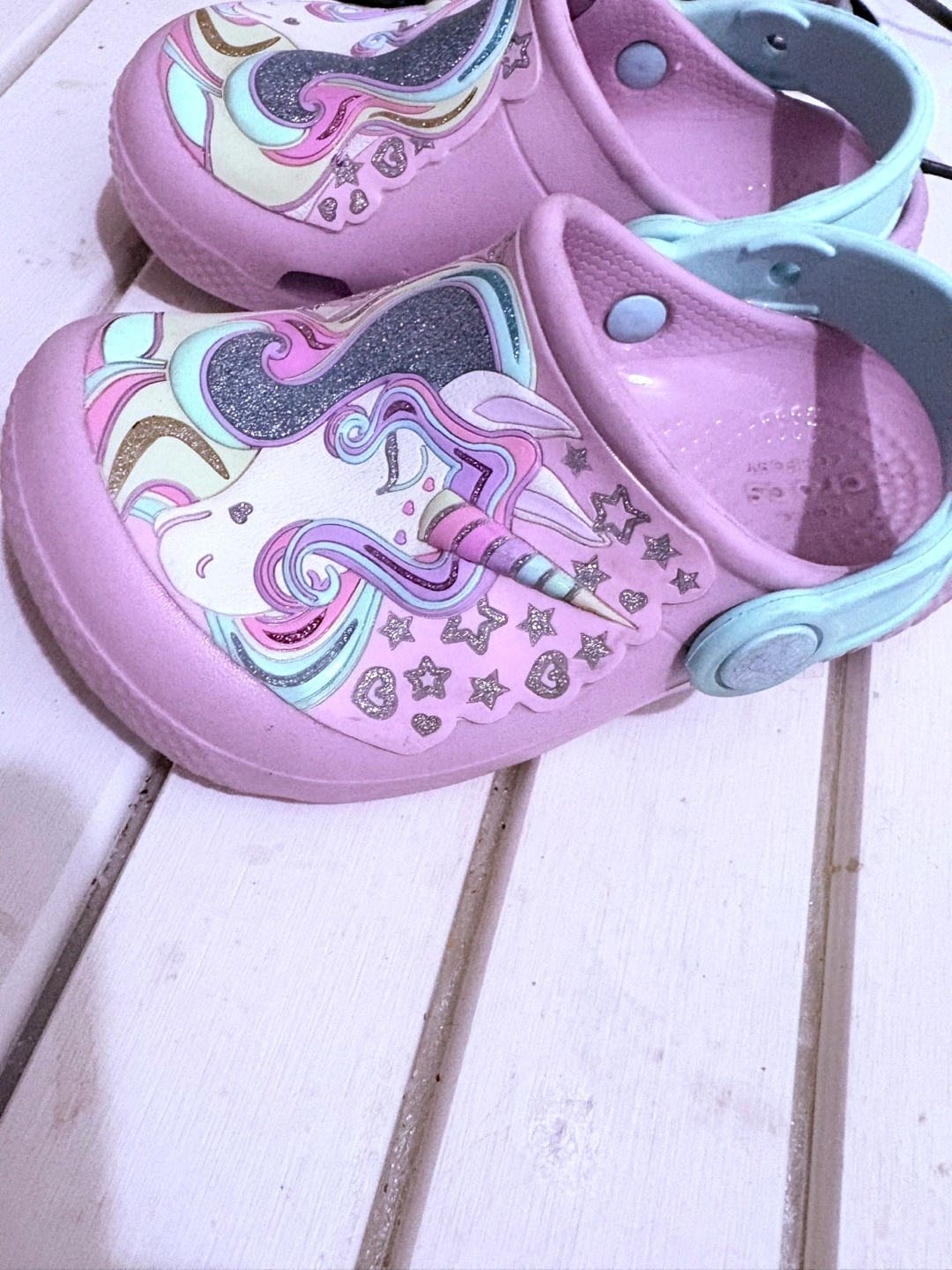 Selling a pair of Crocs Kids' Unicorn Clogs in toddler size 9.
