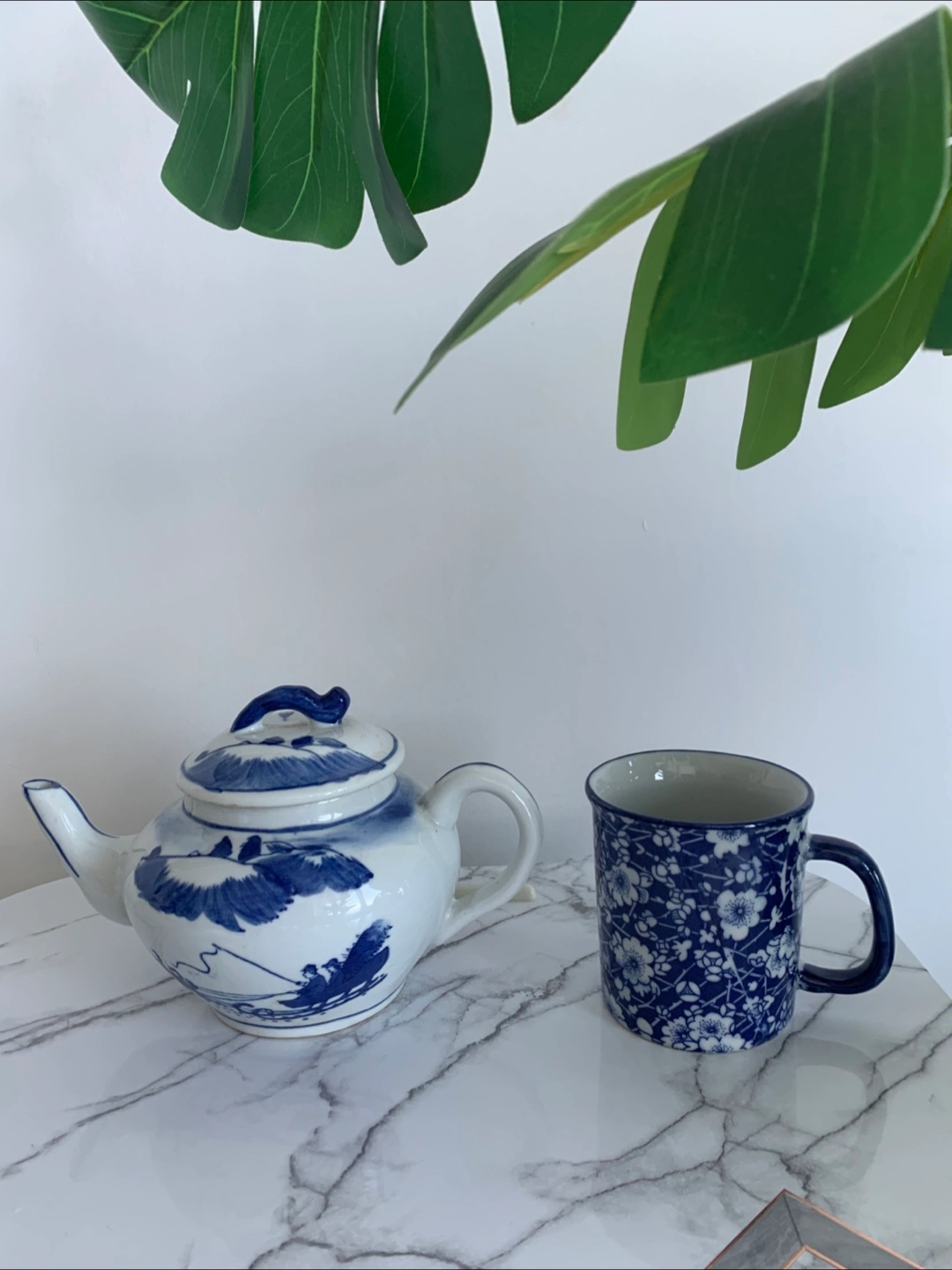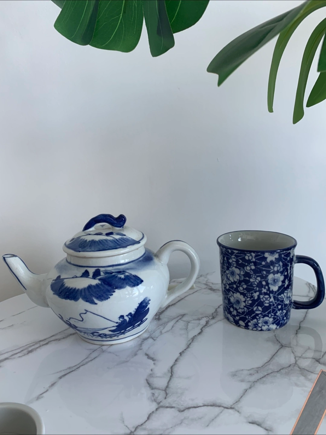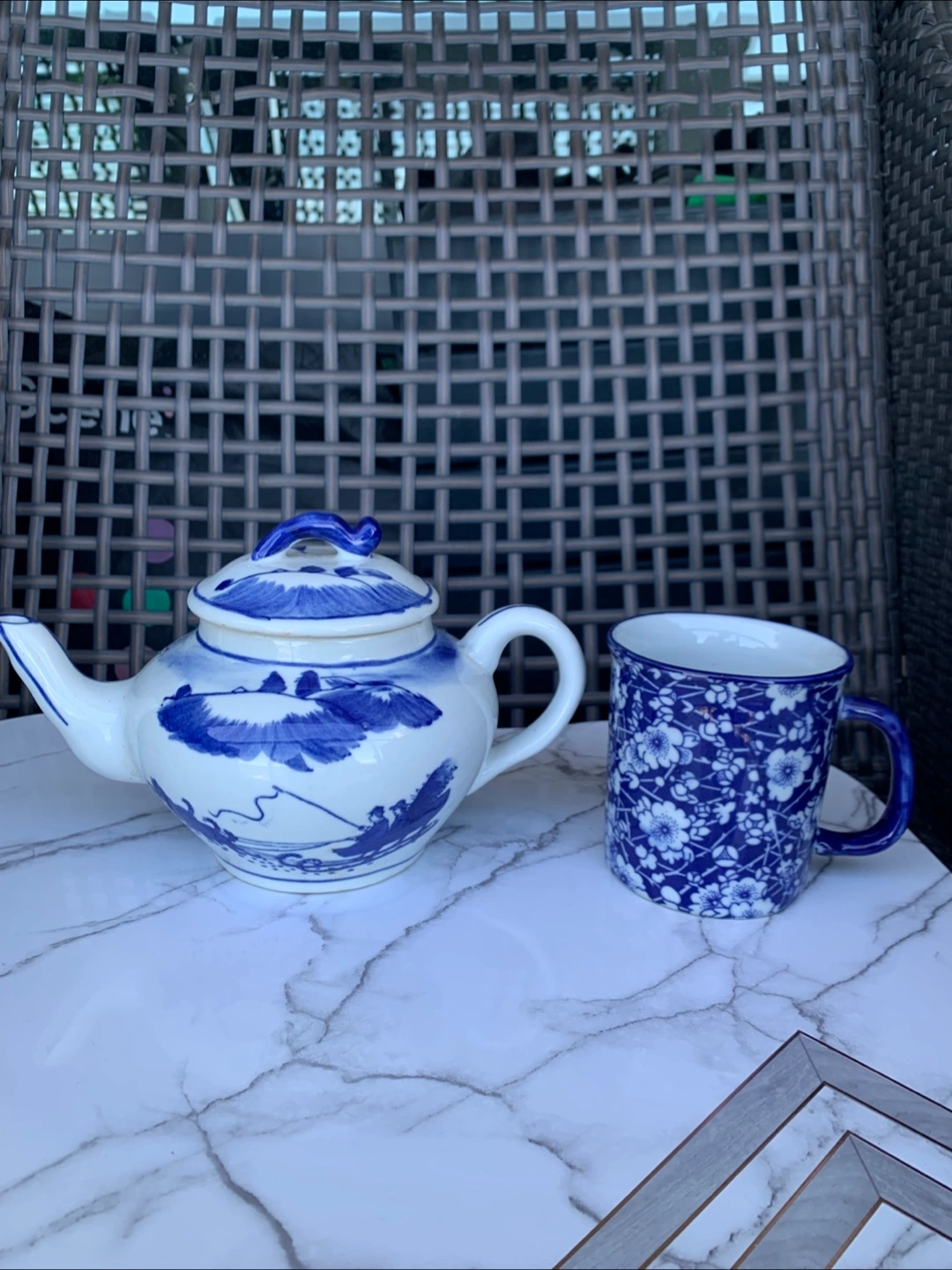 •☕️💙White and blue mug w/ little flowers. Mug wall is very thick and sturdy, and is microwave/dishwasher safe.