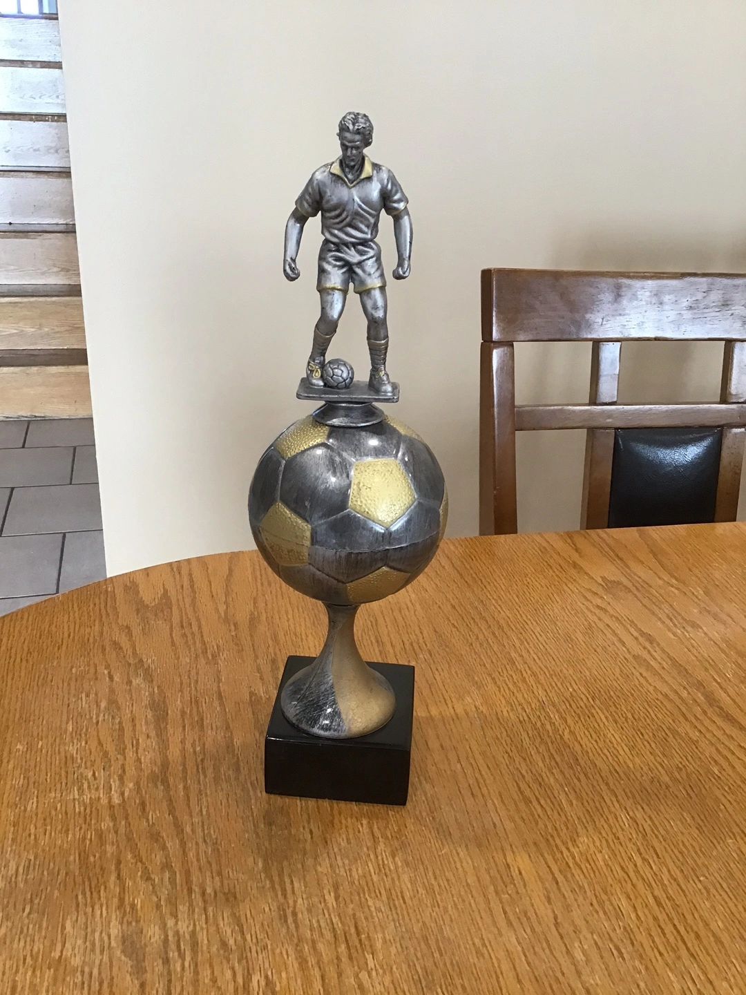 Selling a soccer player trophy. It features a silver-coloured soccer player figure on top of a soccer ball, mounted on a black base. It would be perfect for a sports enthusiast or as a team award