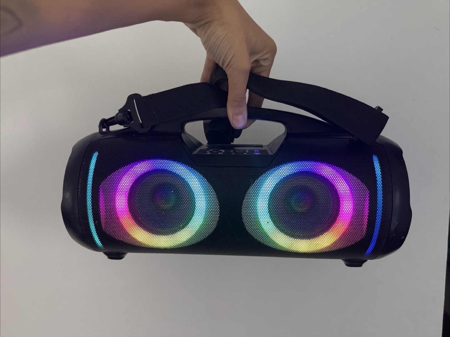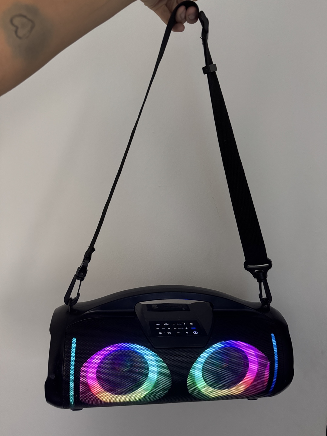 It features cool colour changing lights that add a fun vibe to any setting. It also has a convenient shoulder strap for easy carrying. Perfect for parties or just chilling at home