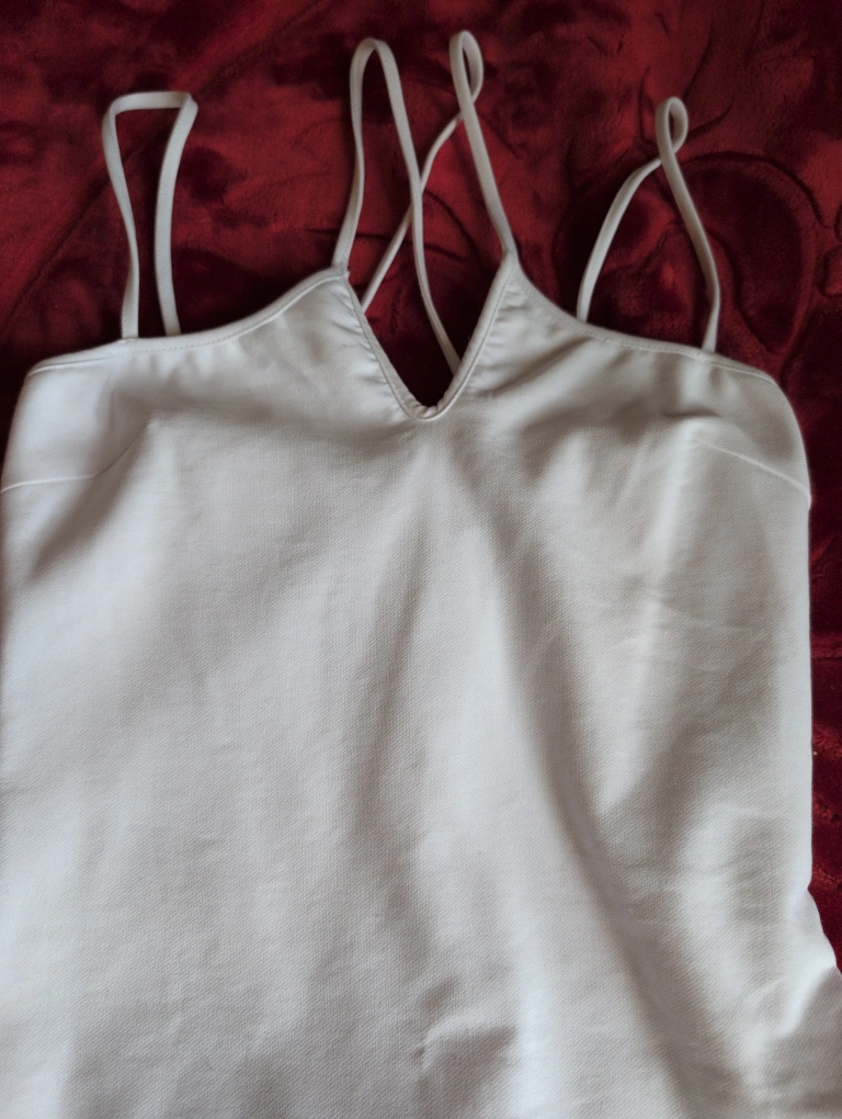 A simple white dress with thin straps. It's in great condition and ready for a new home! The fabric feels soft and comfortable, perfect for warm weather.