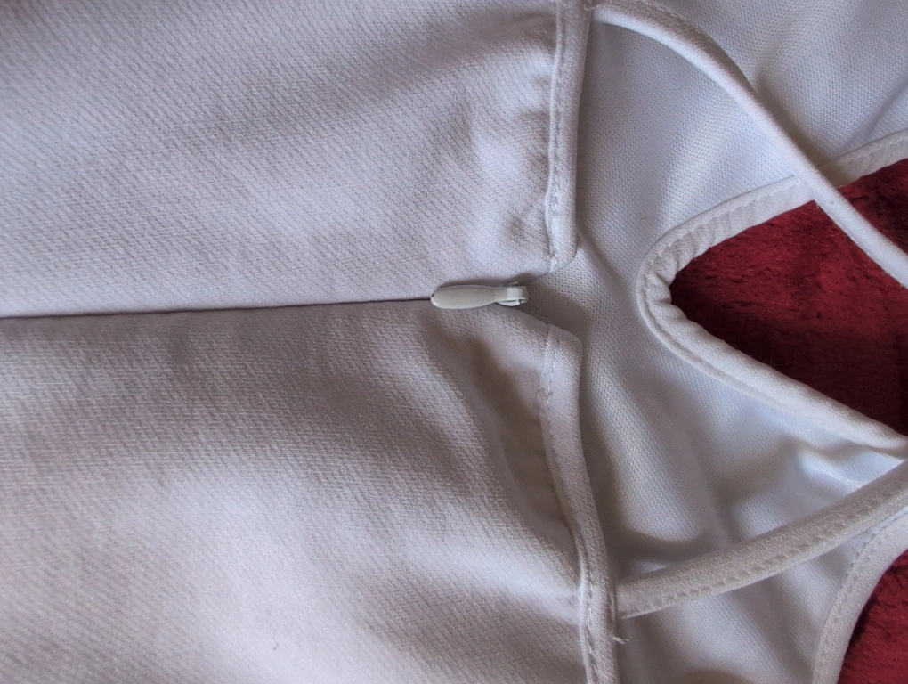 It is very white but in the lighting it looks off-white. I only wore it once and since I've not been able to lose the weight to where it again.