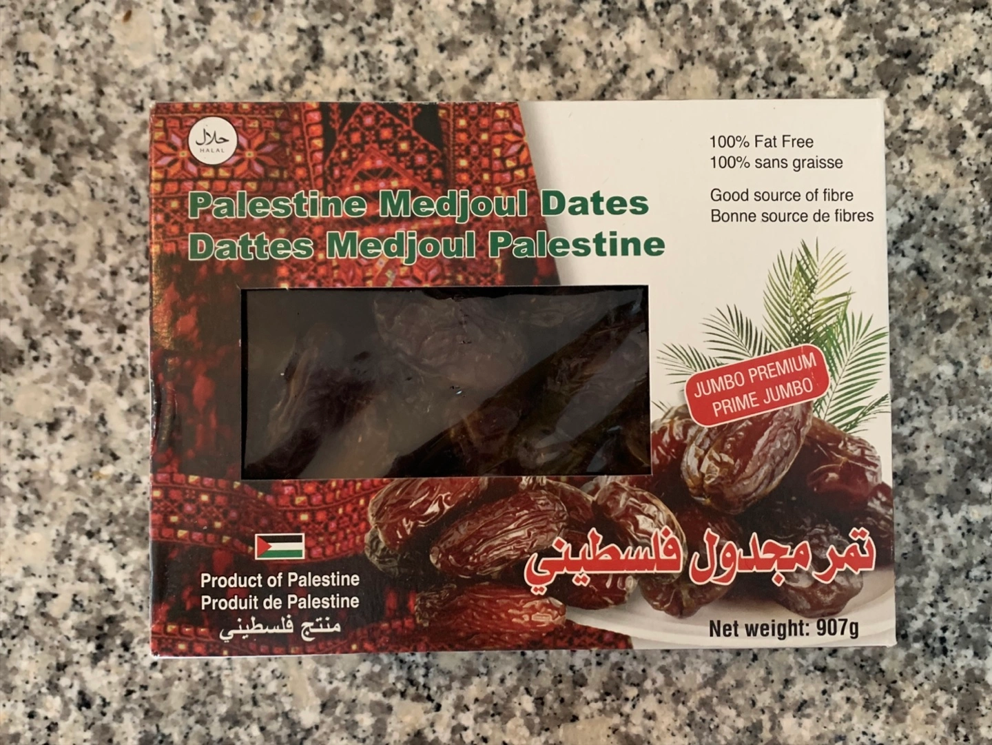 Selling a brand new box of Palestine Medjoul Dates! These are jumbo premium dates. They're 100% fat free and a good source of fibre. Best before December 2026
