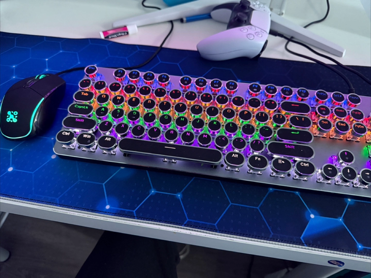 Selling a cool mechanical keyboard and mouse combo! The keyboard has a retro typewriter design with colourful LED backlighting. The mouse complements the keyboard with its ergonomic design and eye-catching logo. Great for adding some flair to your desk setup!