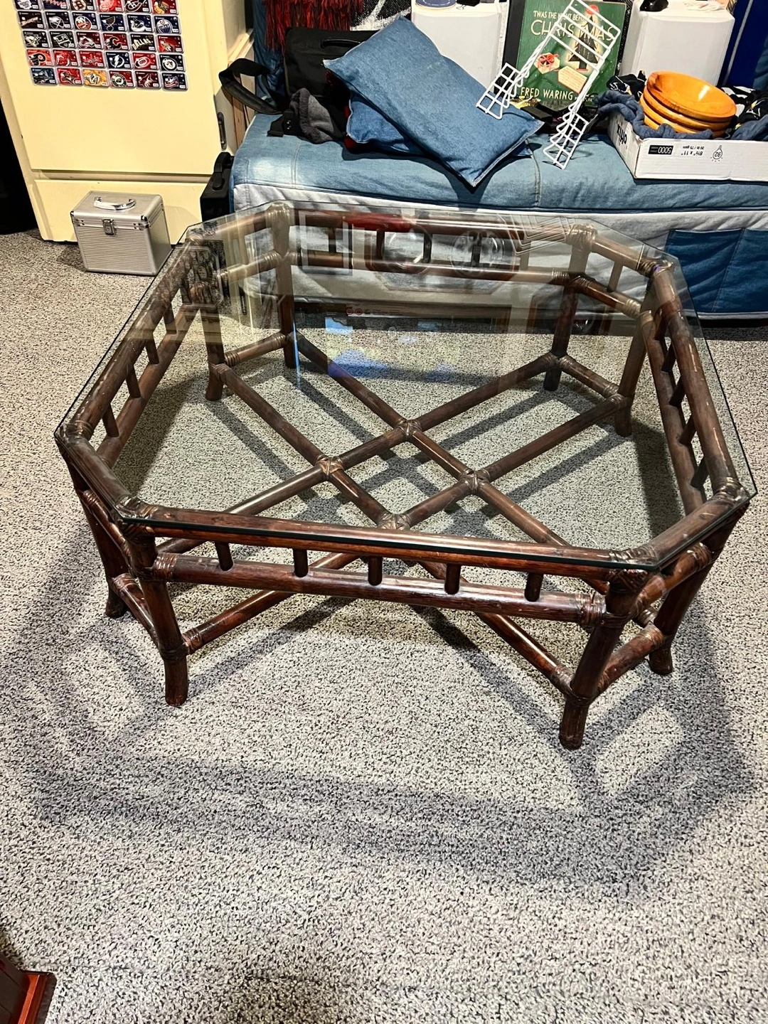 Selling a unique solid wooden glass top coffee table with a bamboo frame. It's in good condition and would be a great addition to any living room. The bamboo gives it a nice, natural look! Table is 16 inches high, widest glass side is 40 x 40 inches. Pet/smoke free home. Asking $200.00 or best offer must sell.