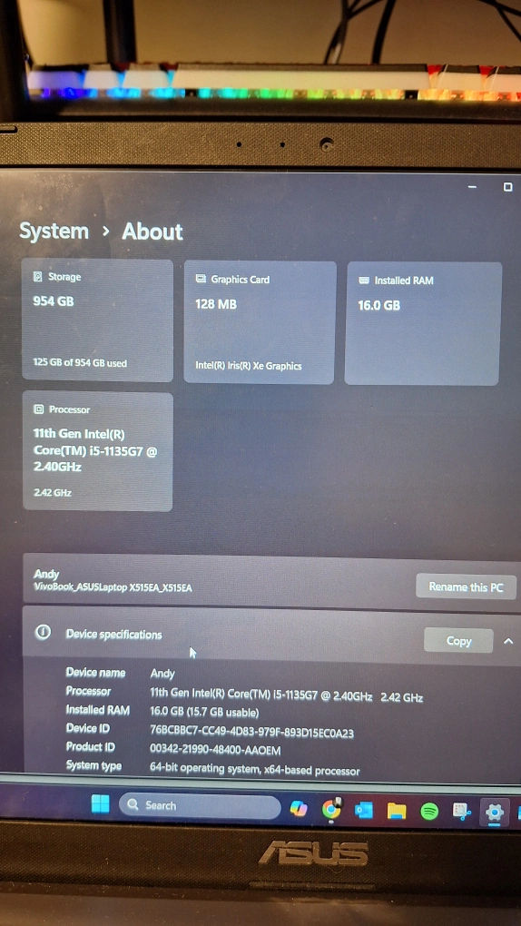 Selling an ASUS Vivobook X515EA laptop. It features an 11th Gen Intel(R) Core(TM) i5-1135G7 @ 2.40GHz processor, 16GB of installed RAM (15.7 GB usable), and 954 GB of storage. It also has an Intel(R) Iris(R) Xe Graphics card with 128 MB of memory. Comes with a charger.