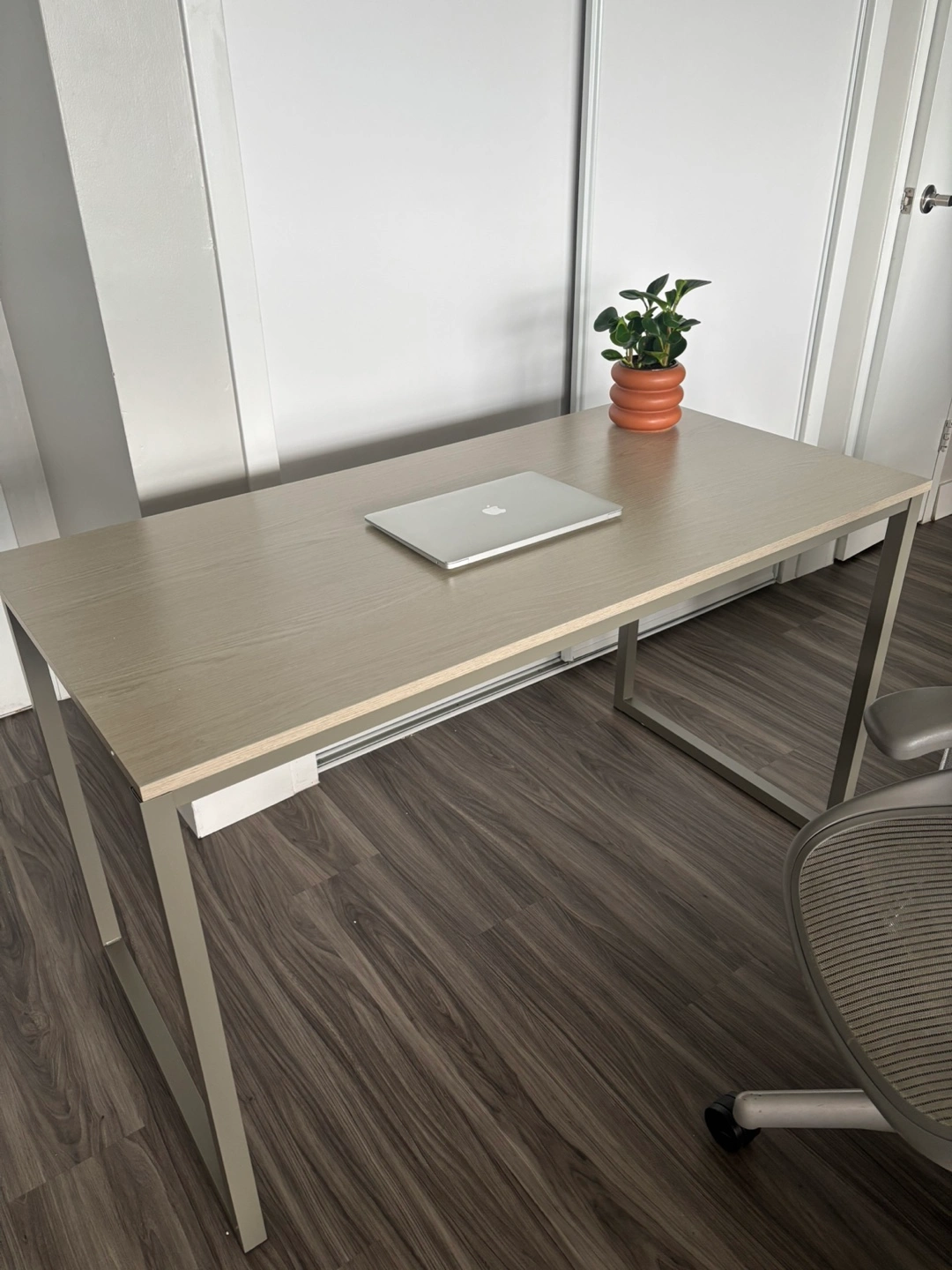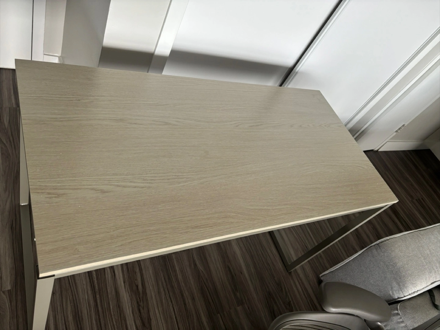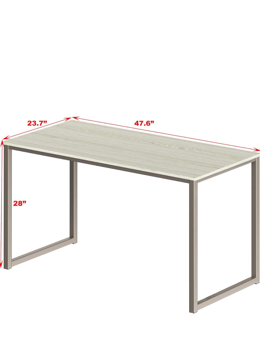 Selling a desk with a light beige top and a metal frame. It's brand new. The dimensions are 47.6" x 23.7" and it stands 28" tall