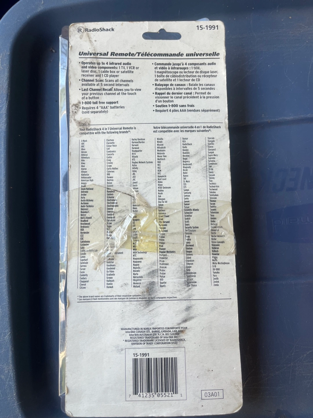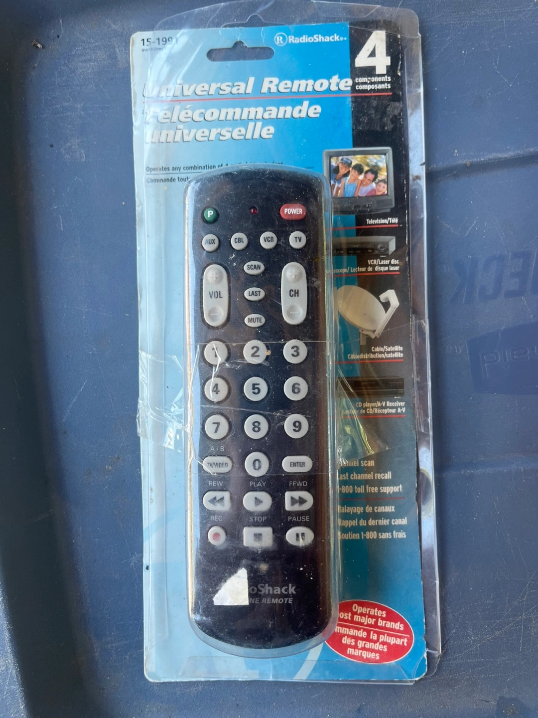 58I'm selling a brand new RadioShack universal remote in its original packaging! It's a 4-in-1 remote, compatible with a wide range of devices like TVs, VCRs, laser disc players, and cable/satellite boxes. It operates up to 4 infrared audio and video components. It also has last channel recall and toll-free support. Requires 4 AAA batteries (sold separately)