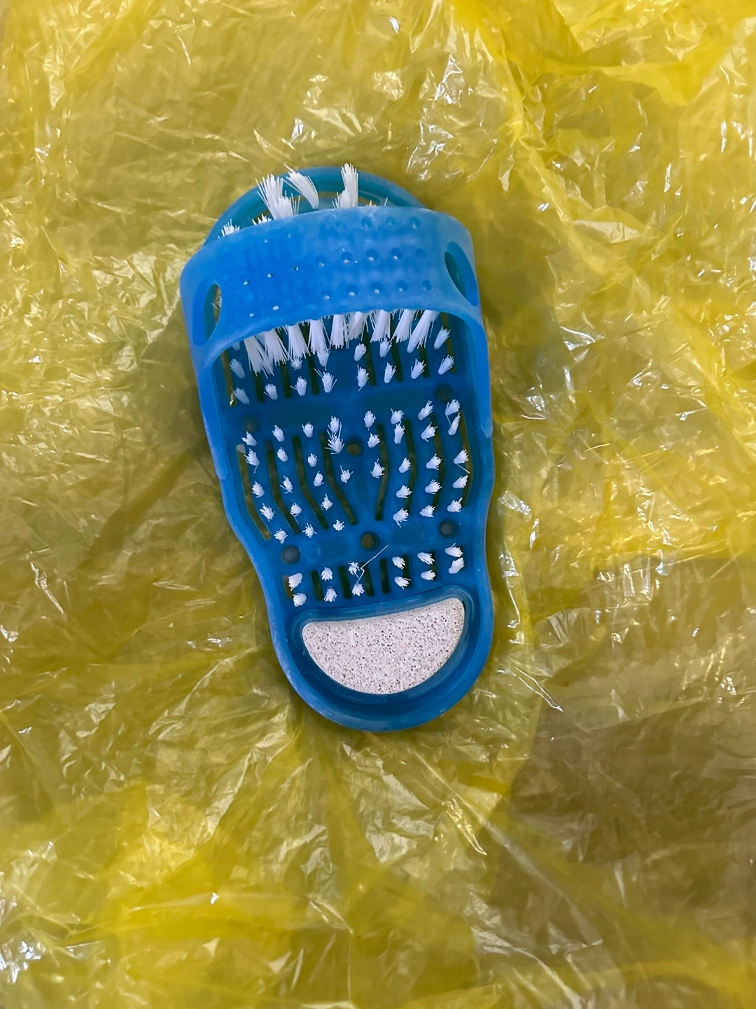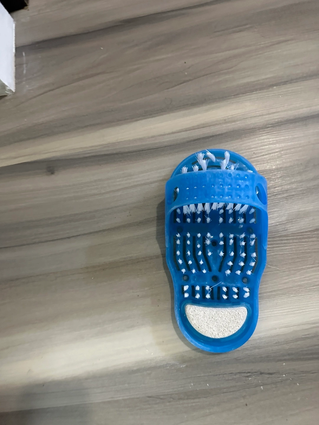 75This is a blue shower foot scrubber. It's designed to clean and massage your feet while you shower. It has bristles and a pumice stone to help exfoliate and remove dead skin. This is a great way to pamper your feet without bending over!