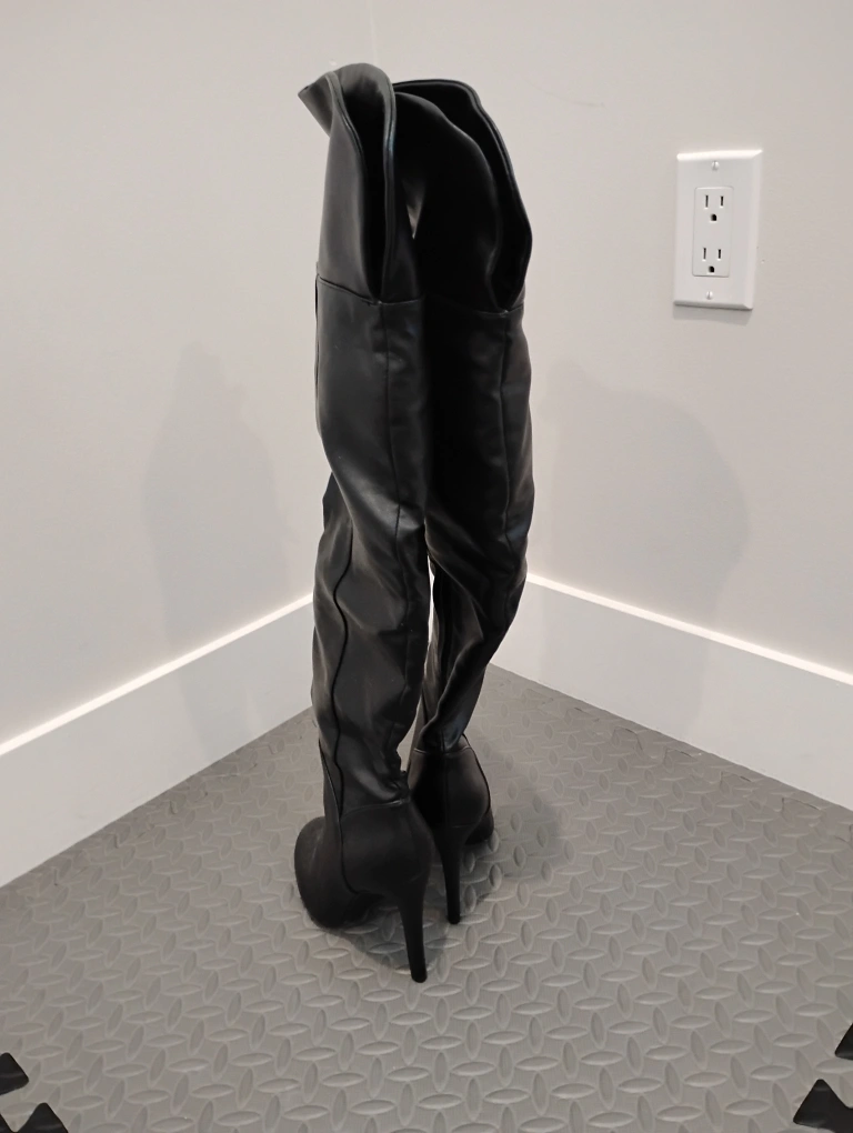 These are a pair of black thigh-high heel boots. They're US size 6, brand new and ready for a new home! Perfect for adding a little flair to any outfit.