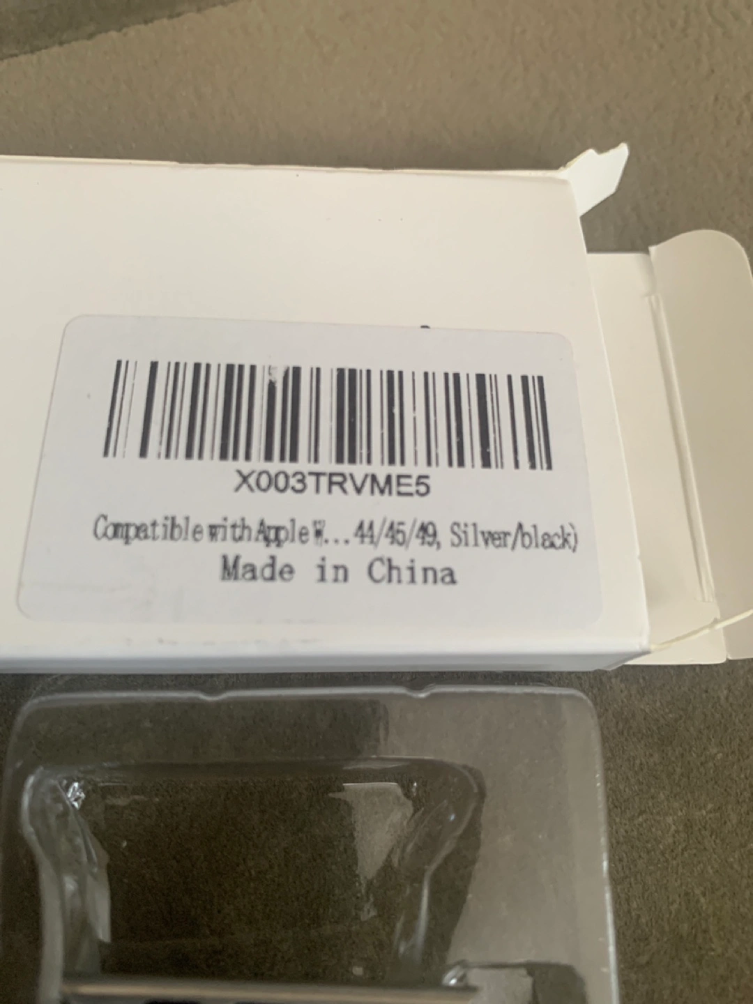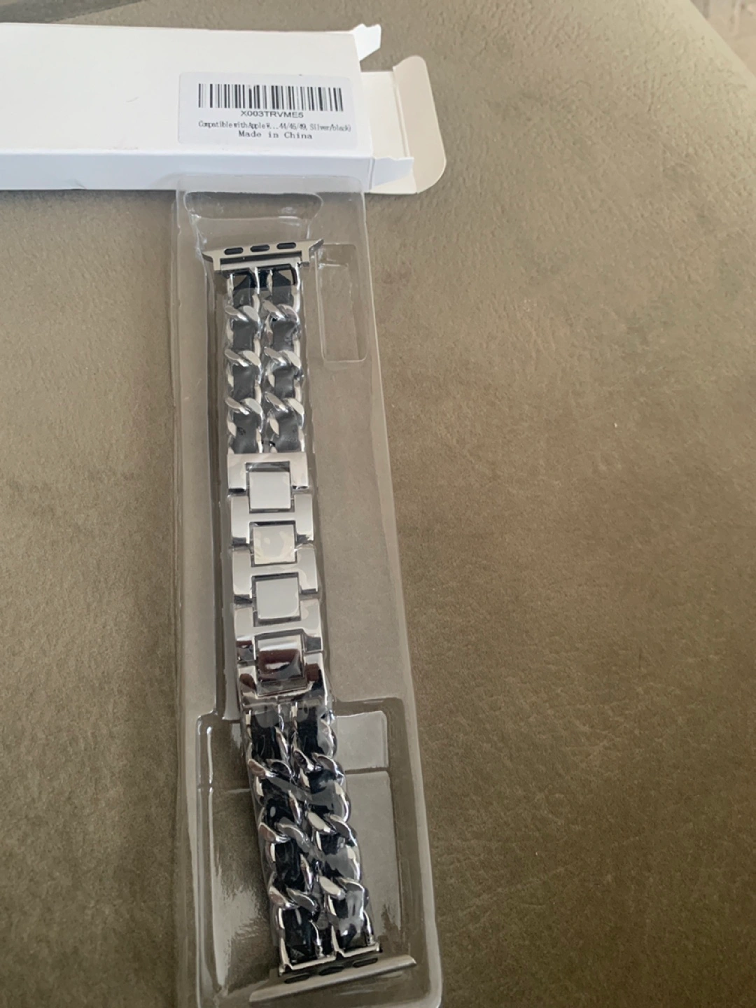 10Selling a compatible Apple Watch band (44/45/49mm) in silver and black! It's brand new and comes in its original packaging. The band has a stylish design that will look great on your Apple Watch
