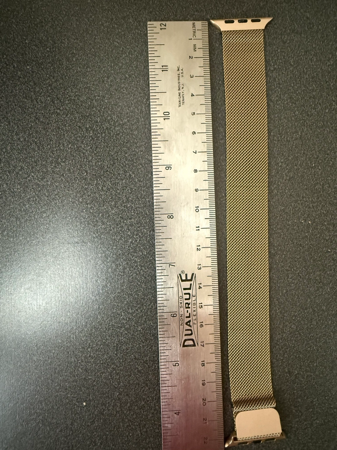 Selling a gold Milanese Loop for Apple Watch, compatible with 42mm, 44mm, and 45mm models. It's in great shape and ready for a new wrist! A gift that was unwrapped, then misplaced now found