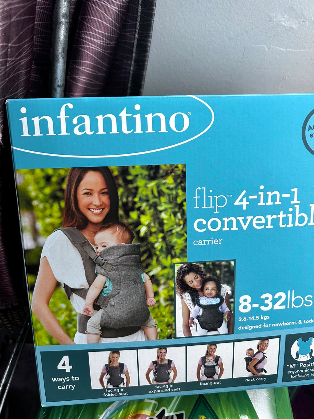 Selling an Infantino Flip 4-in-1 convertible carrier. It's in great condition and ready for a new home! This carrier is designed for newborns and toddlers, supporting weights from 8-32 lbs (3.6-14.5 kgs). It offers 4 ways to carry your little one: facing-in folded seat, facing-in expanded seat, facing-out, and back carry