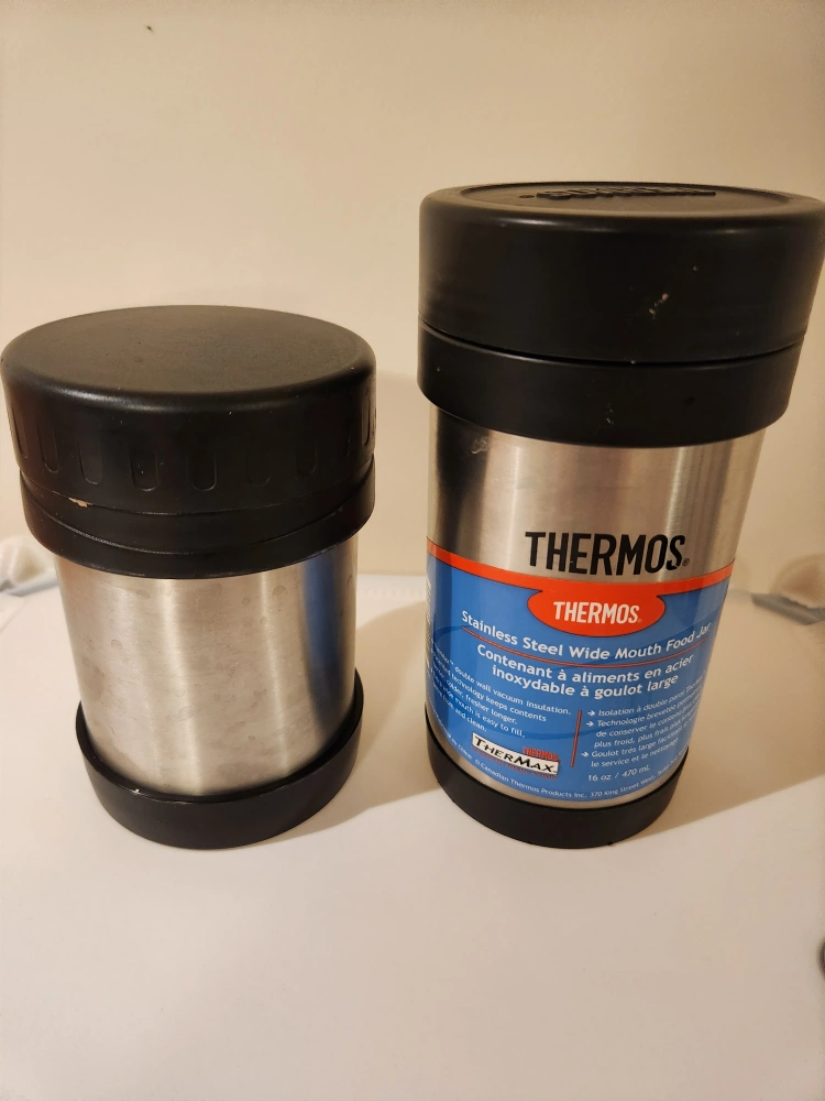 2 Thermos stainless steel wide mouth food jars. They're great for keeping your food hot or cold on the go! The jar is easy to fill and clean, and features double wall vacuum insulation to keep contents at the right temperature for longer.