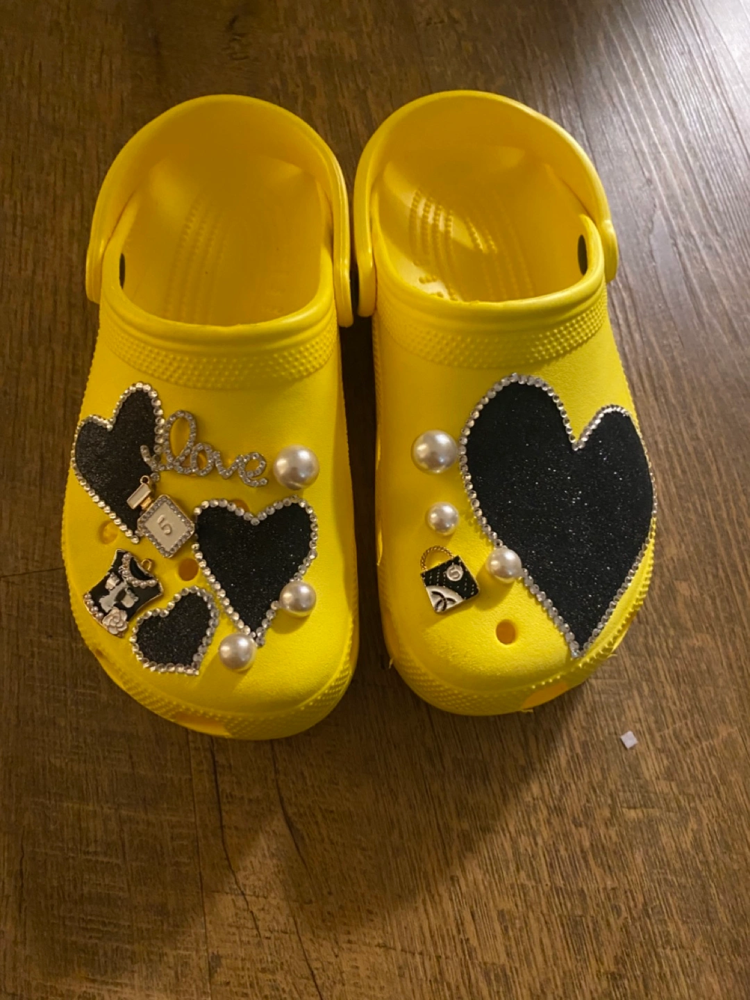 Brighten up your day with these sunny yellow Crocs Classic Clogs! These are a women's size 8 and feature fun heart-themed charms. Perfect for adding a bit of personality and comfort to your everyday wear