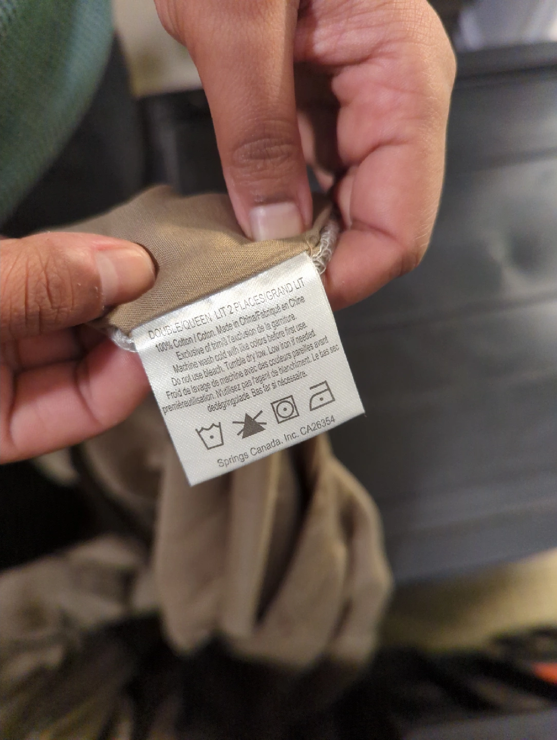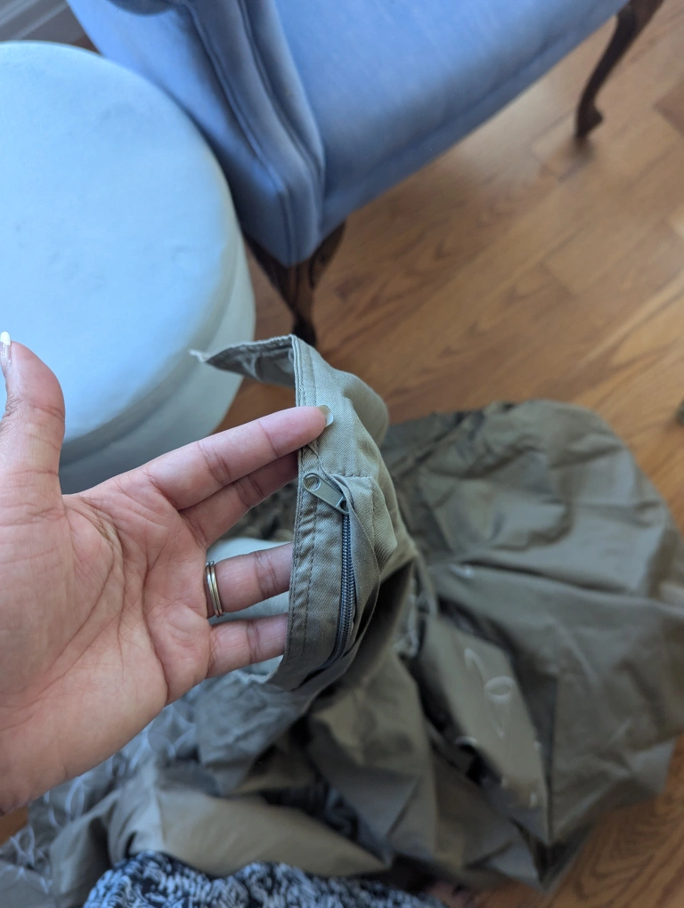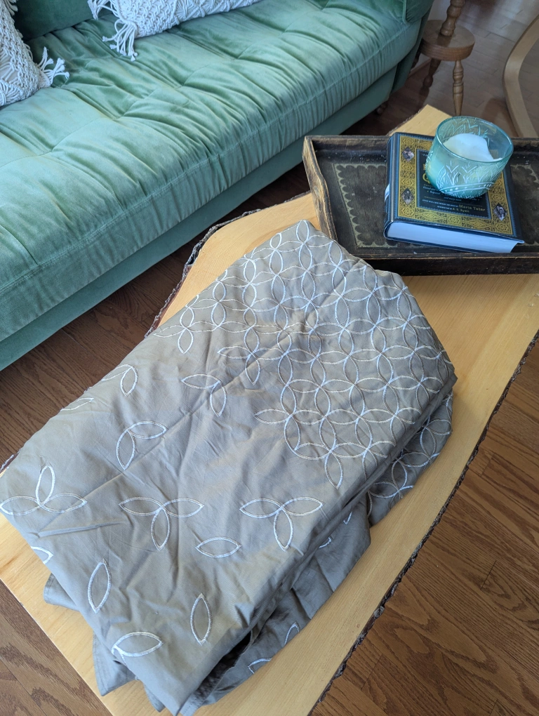 Selling a grey queen duvet cover with white stitching design. In great condition and has a zipper opening.