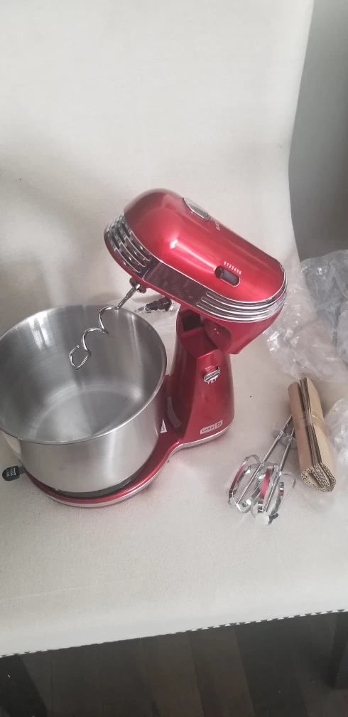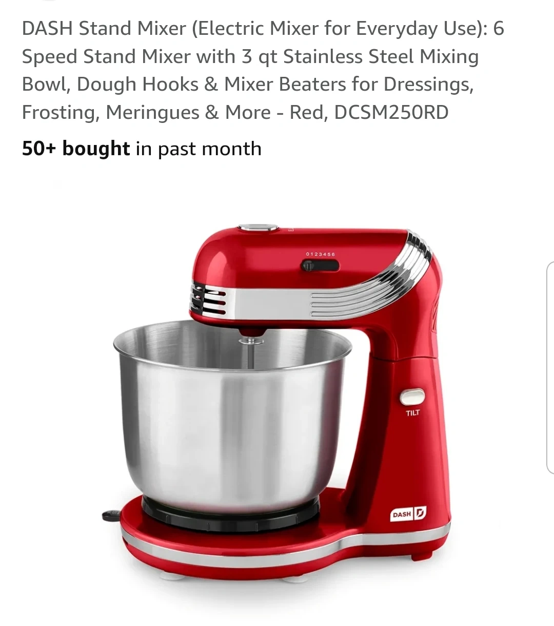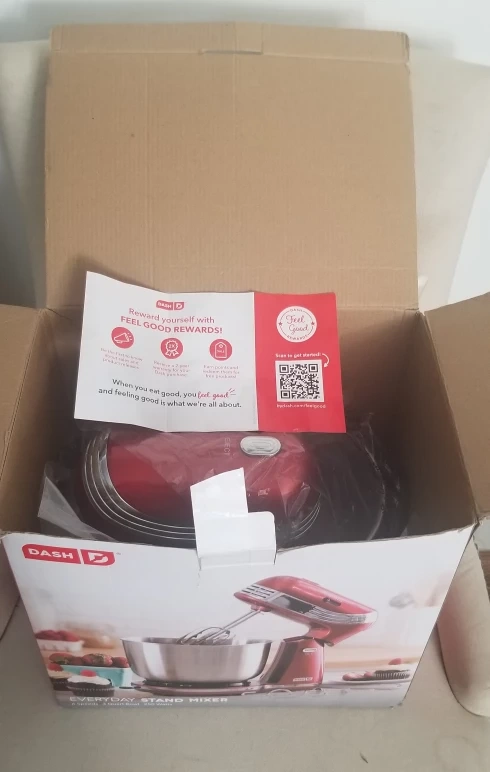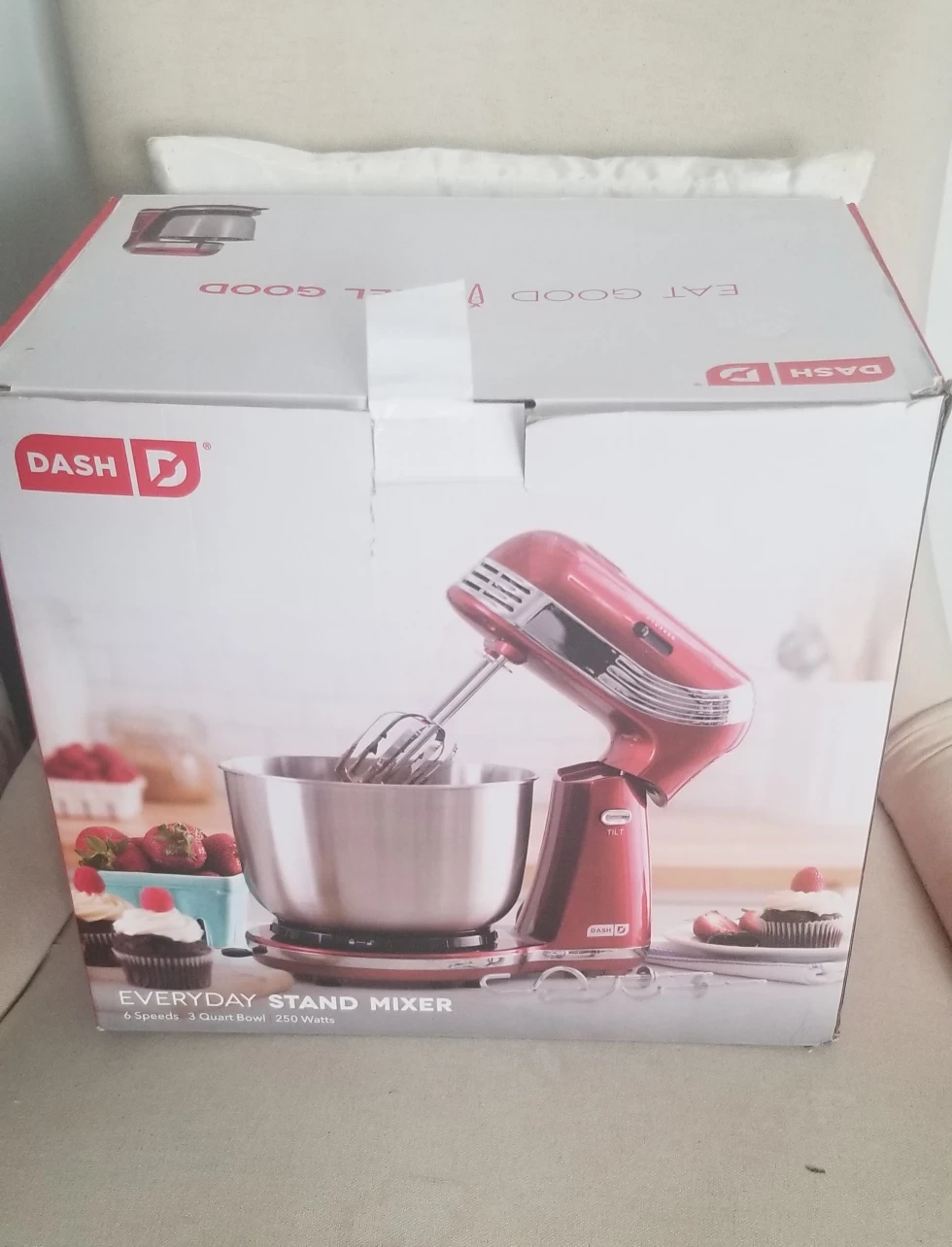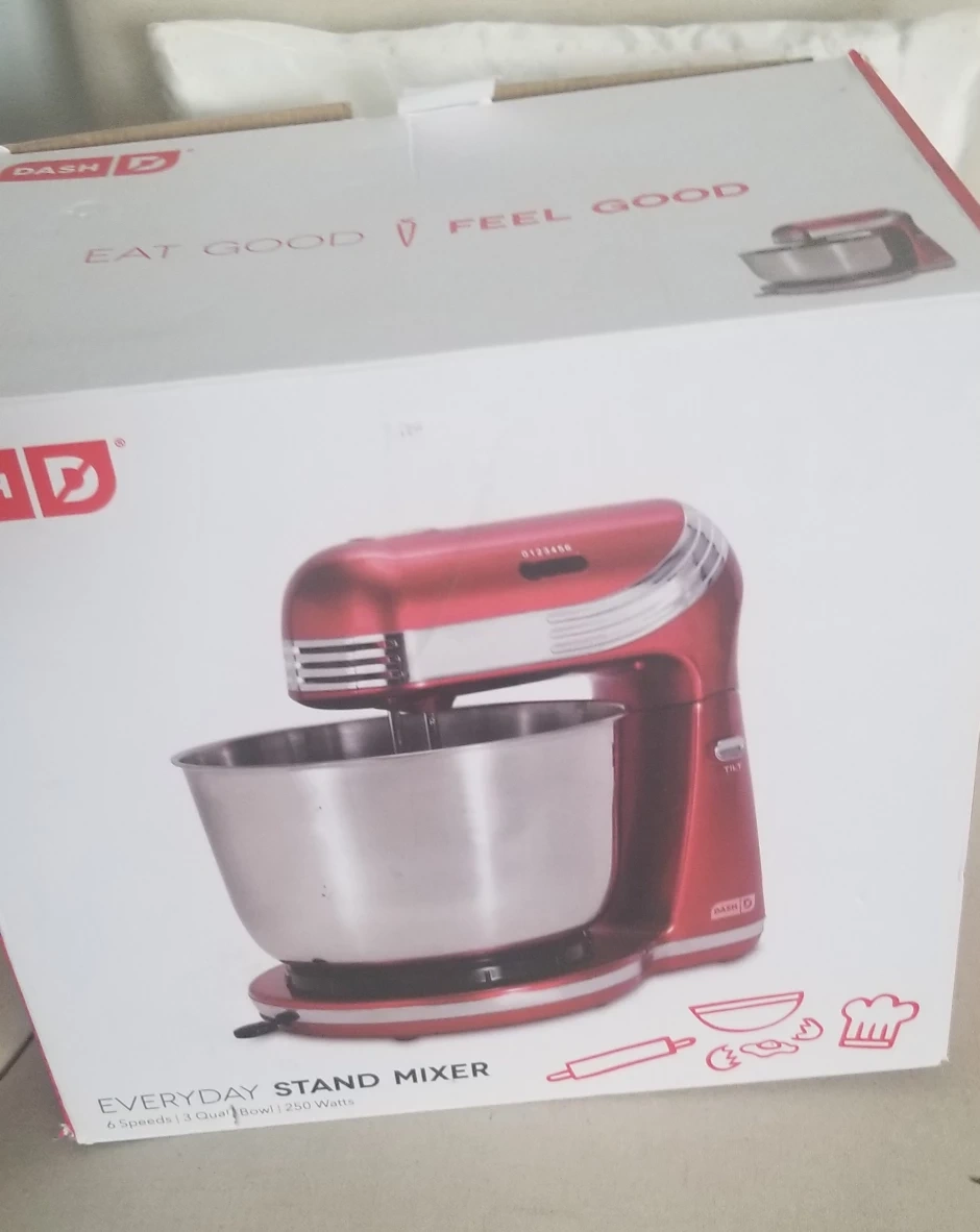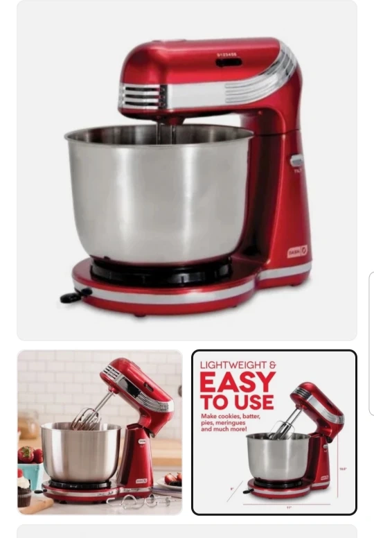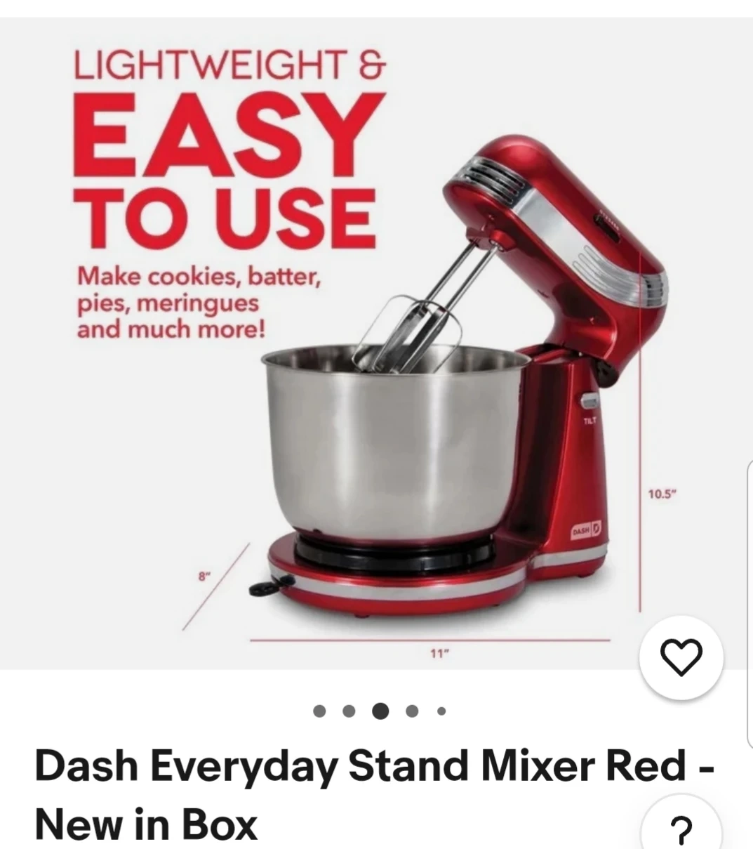 Brand New Dash Everyday Stand Mixer in red! It comes with 6 speeds and a 3 quart stainless steel mixing bowl. Also includes dough hooks and mixer beaters for dressings, frosting, meringues and more! It's lightweight and easy to use. The box is included I bought it for my daughter as a gift but her friend gave her one sooner than me!