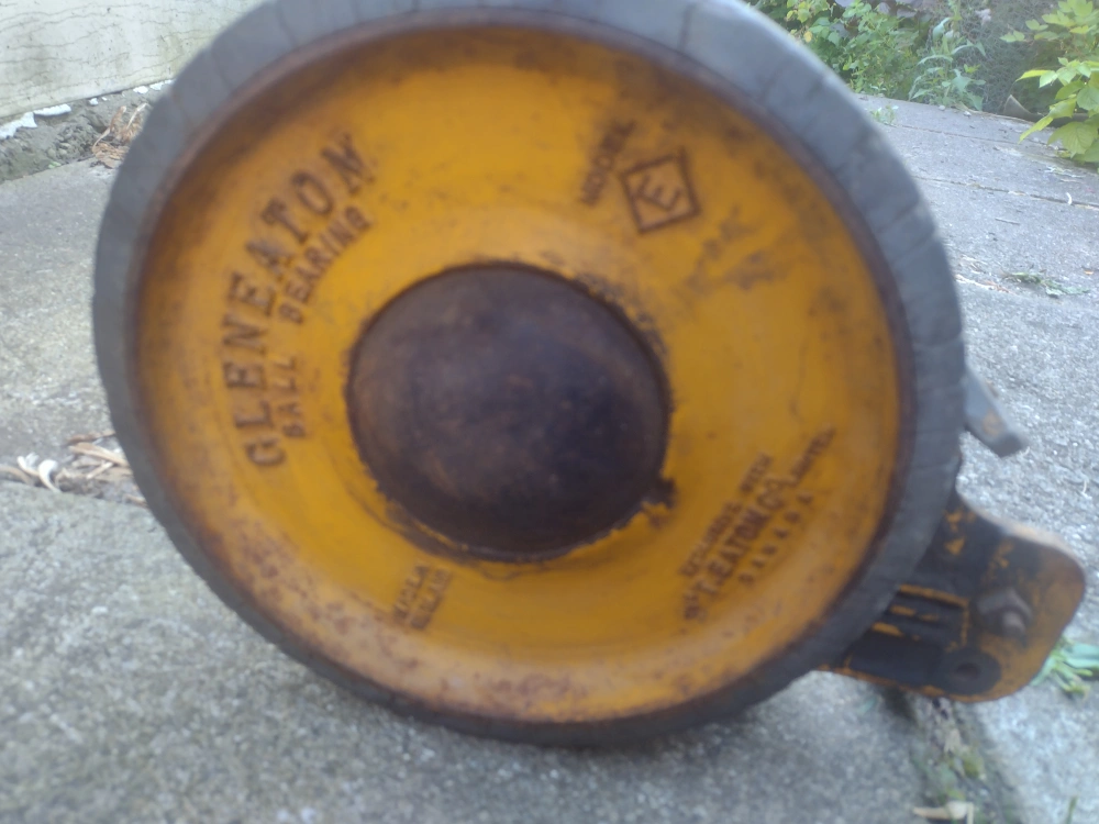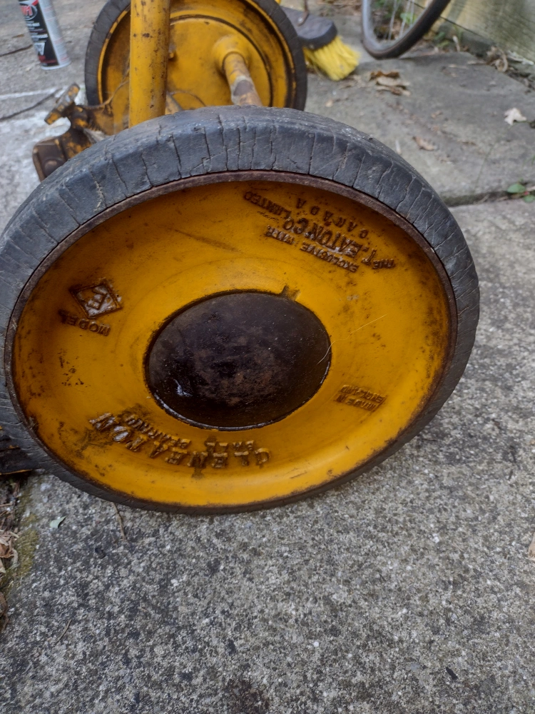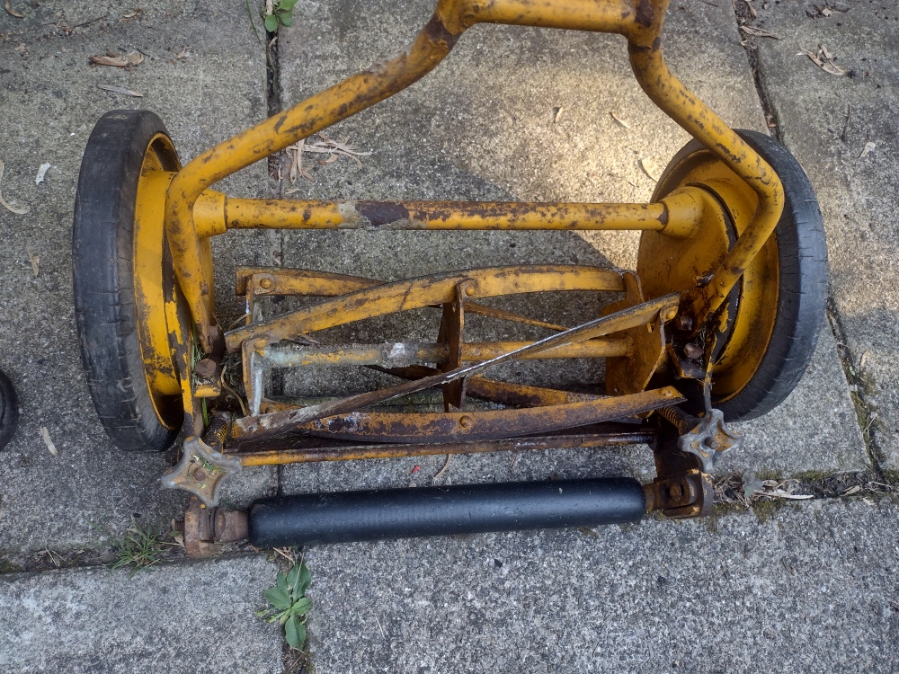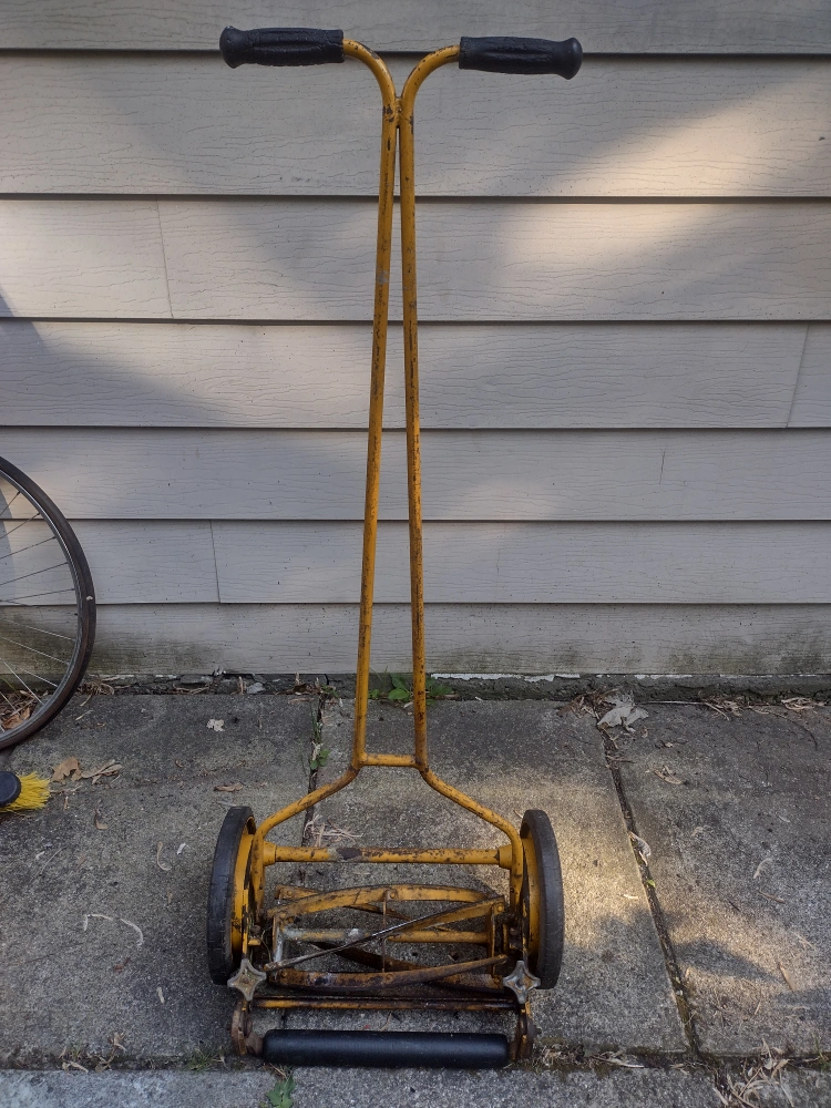 A vintage Gleneaton ball bearing push mower. Painted yellow; black handles. It definitely shows signs of wear and tear, but still has a lot of character! Handy, if power goes out or for small lawns. It is rusty, but it served me well and it hard for me to just make it a metal scrap.