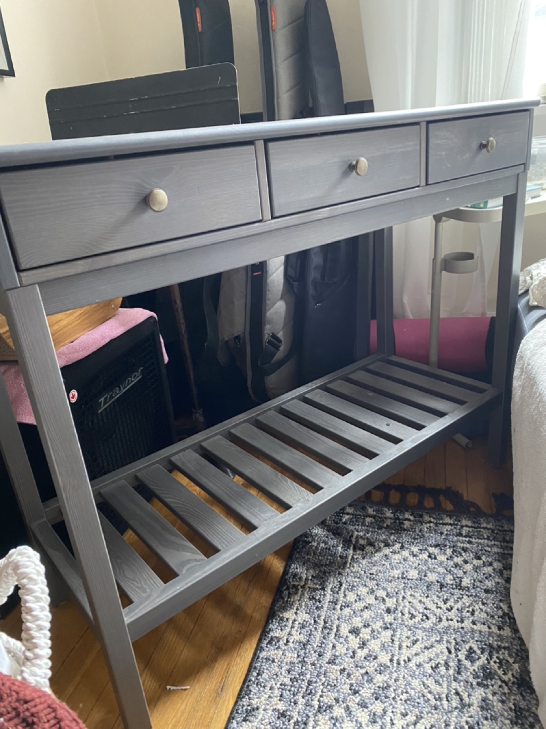 DISCONTINUED Ikea Credenza with updated hardware. We still have the original knobs if you wish for them to be included as well. Basically brand new, just doesn’t suit the space anymore.