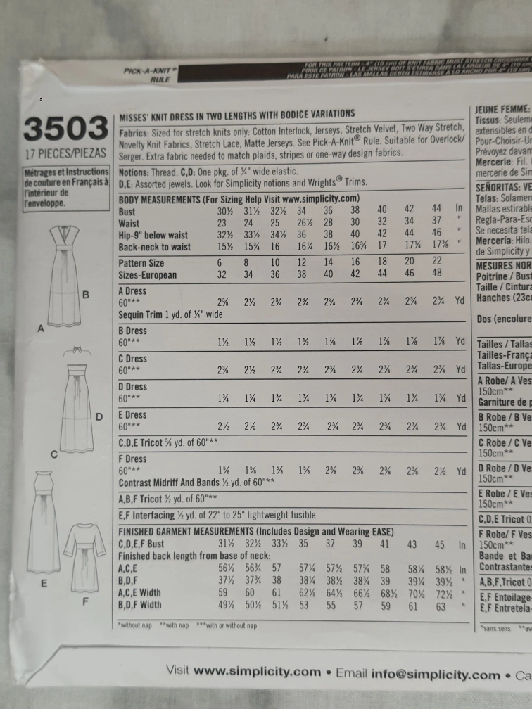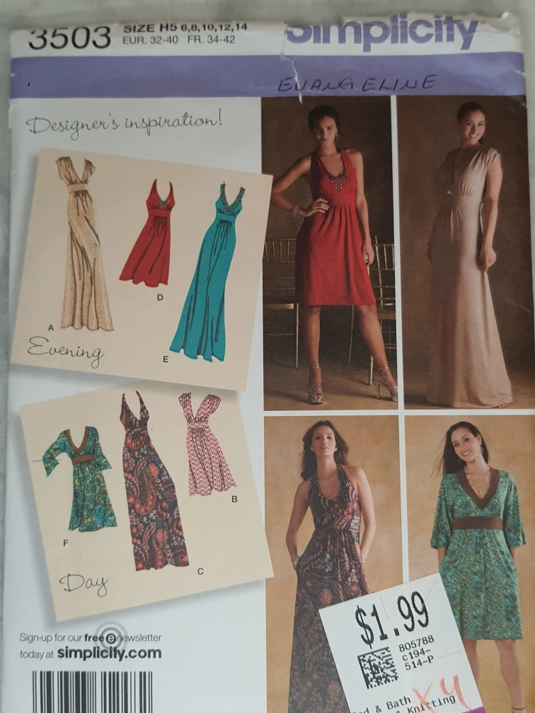 Selling a Simplicity sewing pattern, number 3503. This pattern is for knit dresses in two lengths with multiple bodice variations. The pattern includes sizes 6, 8, 10, 12, and 14 (EUR 32-40, FR 34-42). Perfect for creating your own unique dresses!