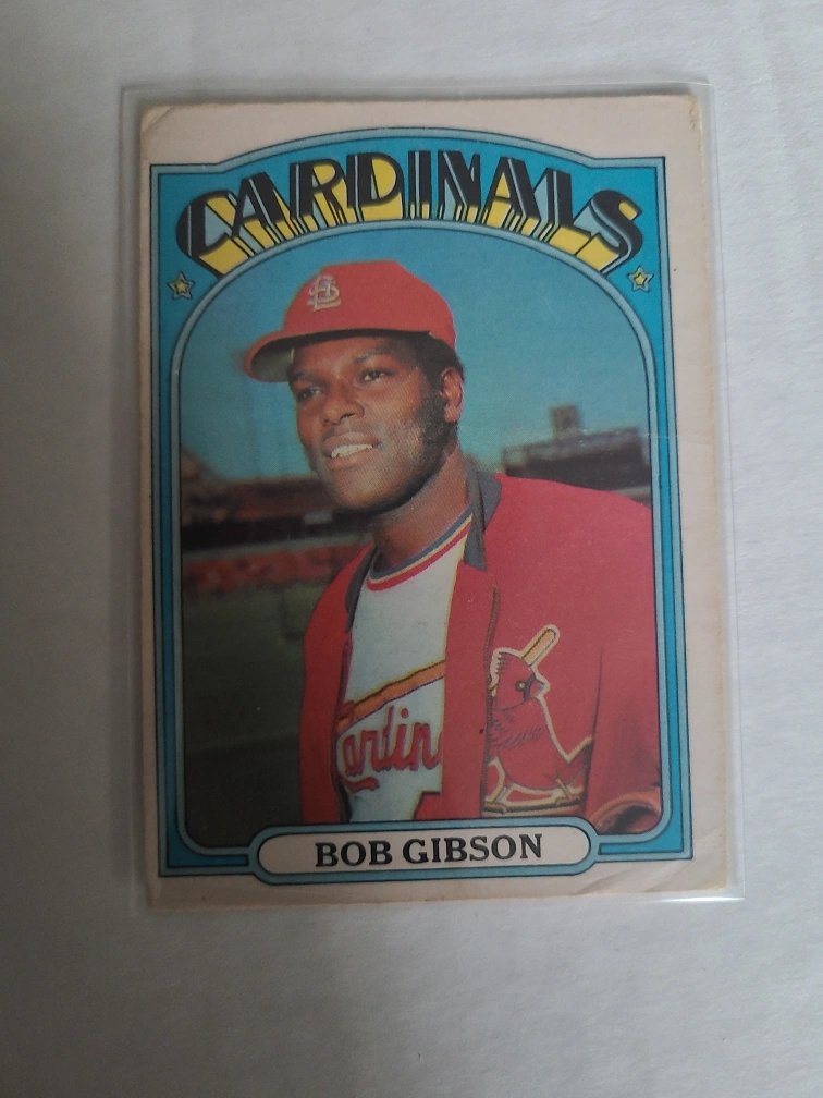 Selling a 1972 Bob Gibson baseball card featuring him as a pitcher for the St. Louis Cardinals. The card includes his stats and is printed in Canada.
