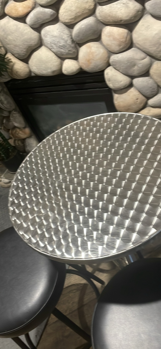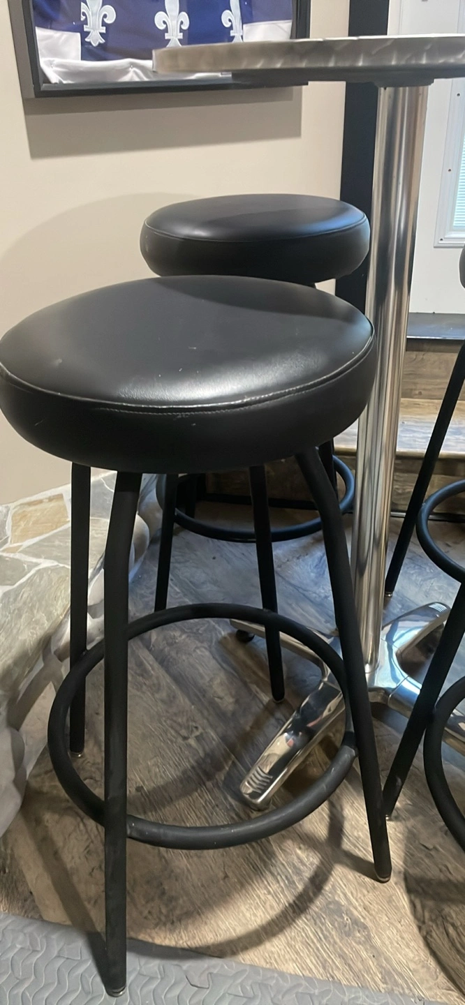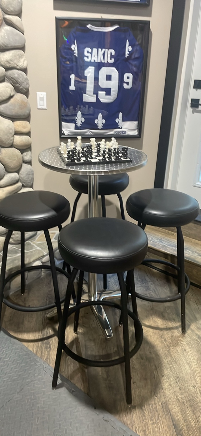 Selling a bar table with four stools. The stools have black seats and black metal legs. The table is a round, metal design. Great for a basement or rec room!
