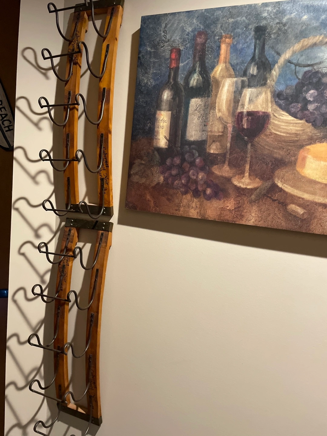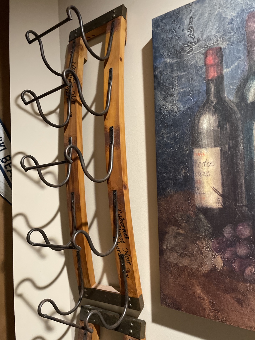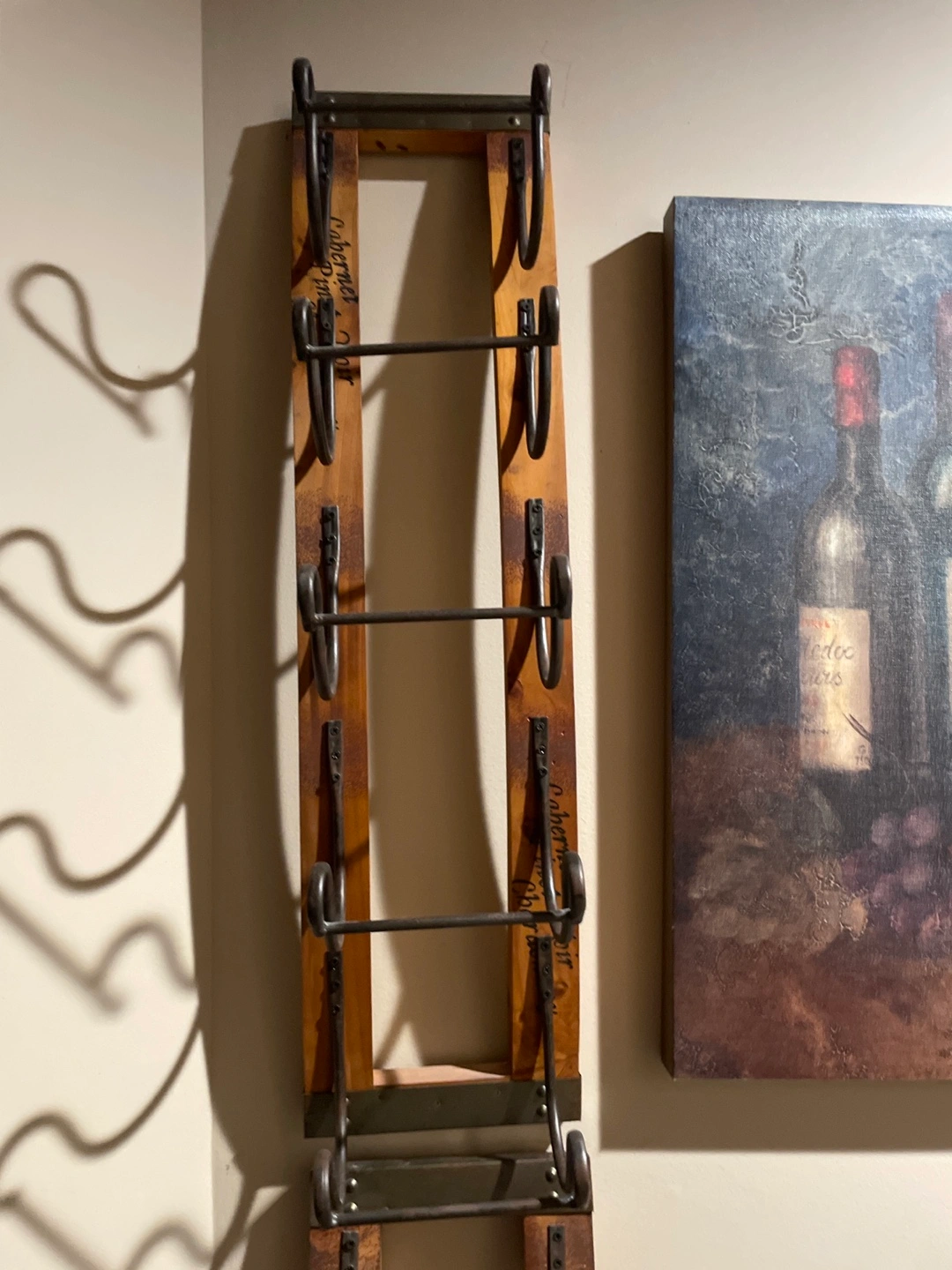 Selling a rustic wooden wine rack. It's a charming piece to display your wine collection. It's in good condition and ready for a new home!