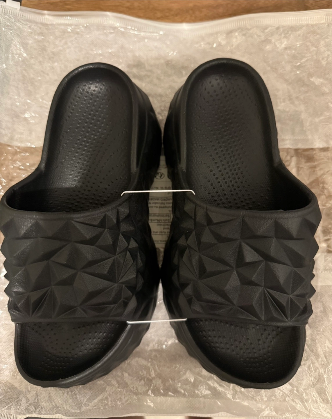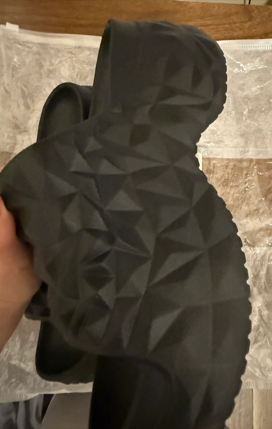 Selling a pair of black slides in great condition! They feature a unique geometric pattern on the upper part of the slide. These are perfect for casual wear or lounging around
