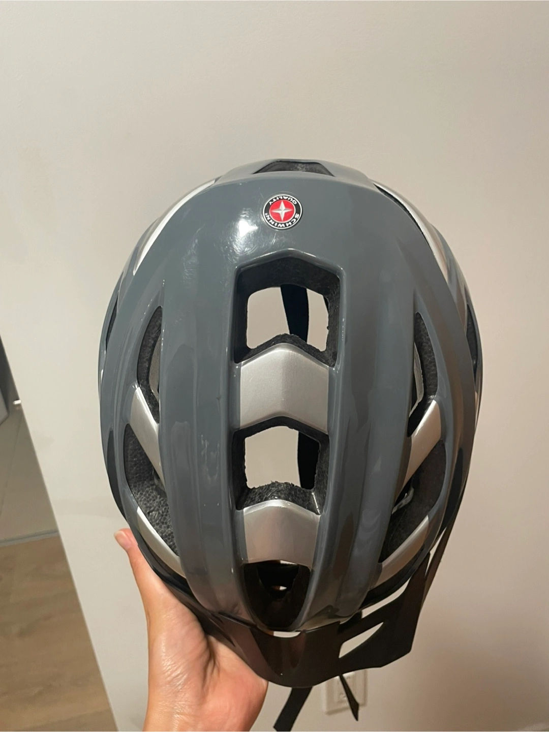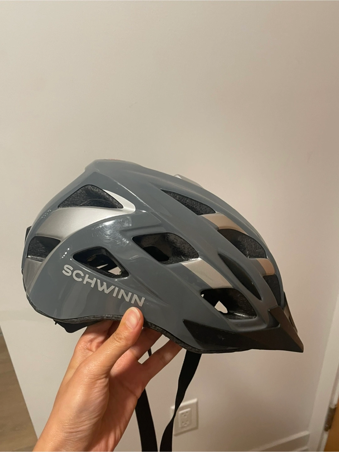 Selling a Schwinn bike helmet in grey. It's in great shape and ready for your next ride! Perfect for staying safe while cycling around town or hitting the trails