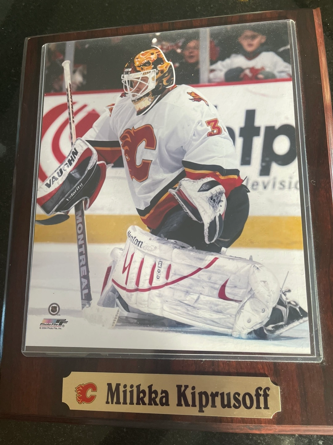 Framed photo of Miikka Kiprusoff, the Calgary Flames goalie. The photo is from Photo File, Inc. in 2004. It features Kiprusoff in full goalie gear with the Flames logo. A nameplate at the bottom reads "Miikka Kiprusoff".