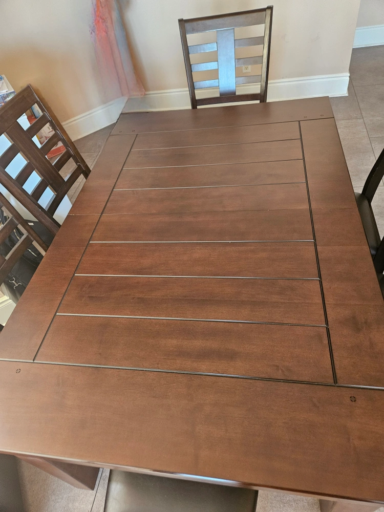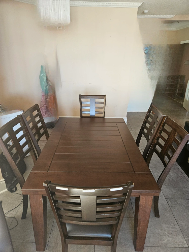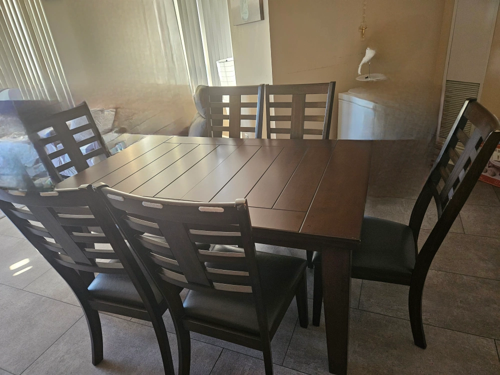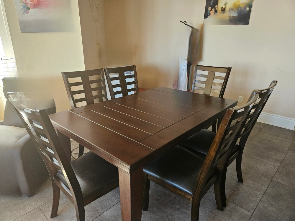 Selling a dining table with six chairs. The set is a dark brown wood, perfect for a family dining room or kitchen. It's in great condition and ready for a new home! The table is expandable and get bigger
